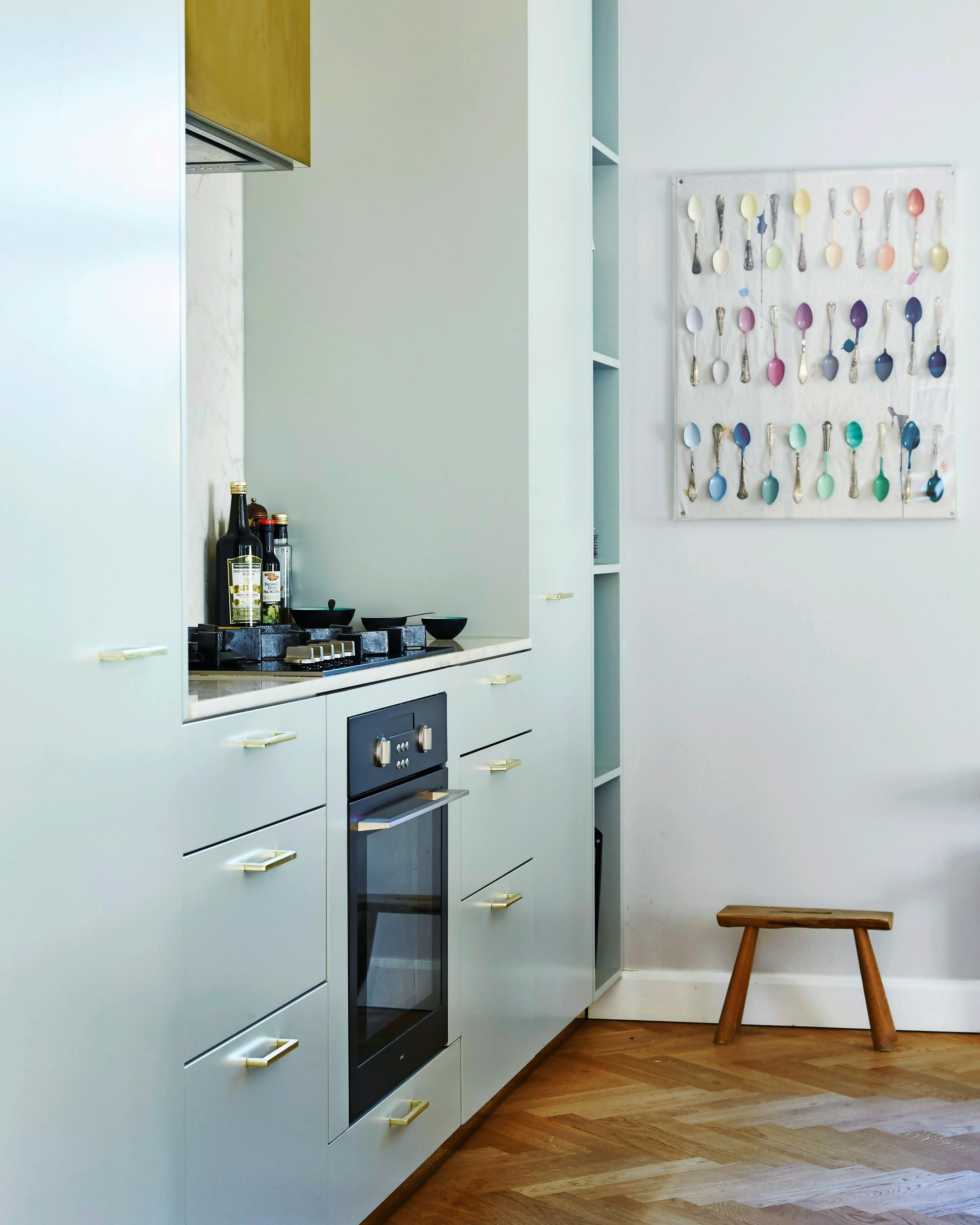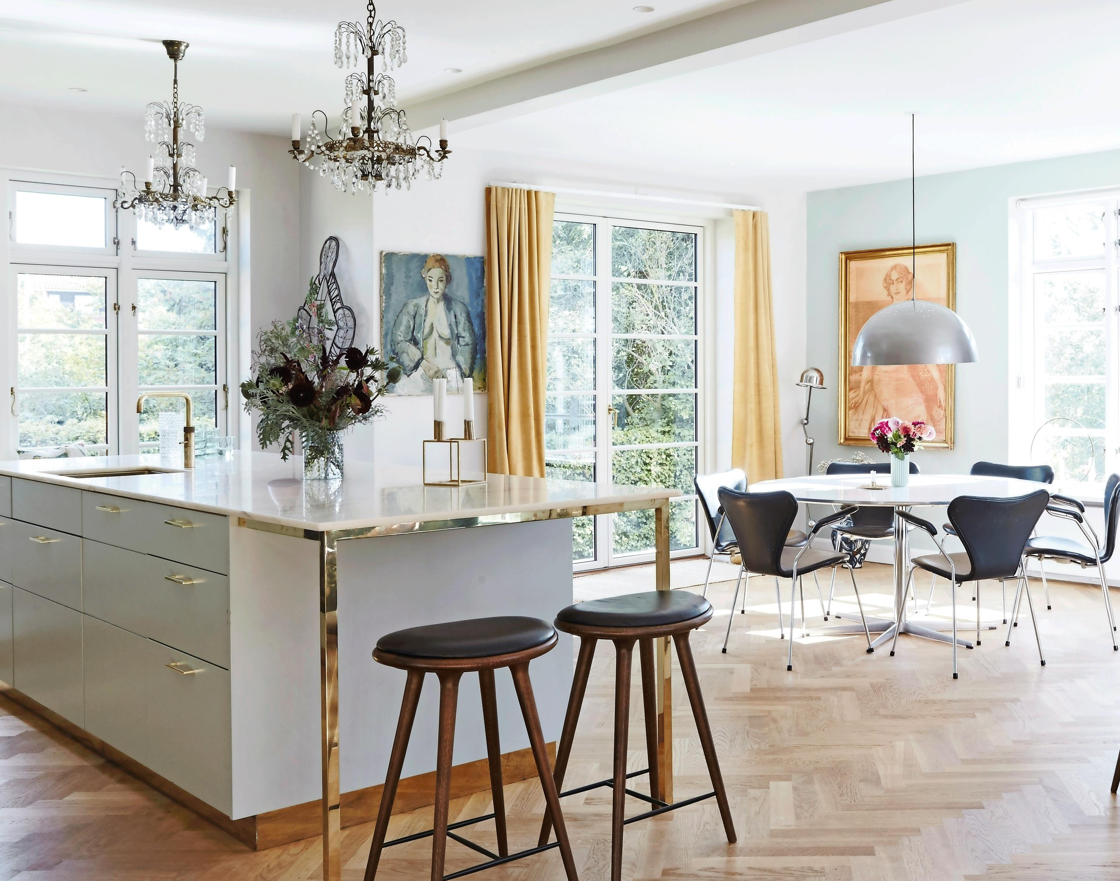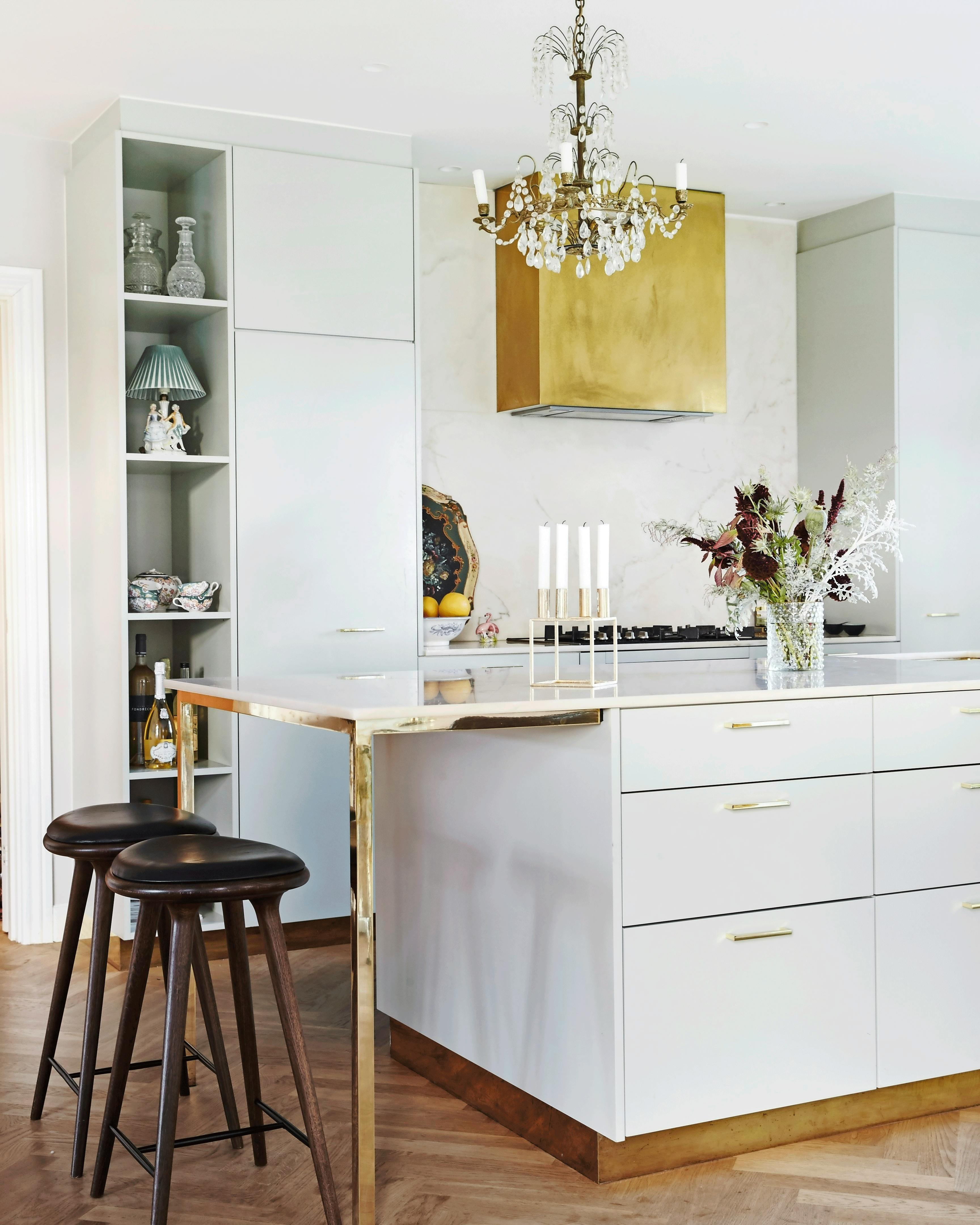 Et standardkøkken kan blive opgraderet med særlige detaljer såsom messingdetaljer, der som her er udført af en gørtler. Modsat en smed tager gørtlere sig af mindre opgaver i metal – ofte med vægt på kunstnerisk udførelse. Barstole fra Mater, lysestage fra by Lassen og glasvase fra H&M Home. Lampen med porcelænsfigurer er fundet hos Jolander, mens karafler og testel er arvestykker.