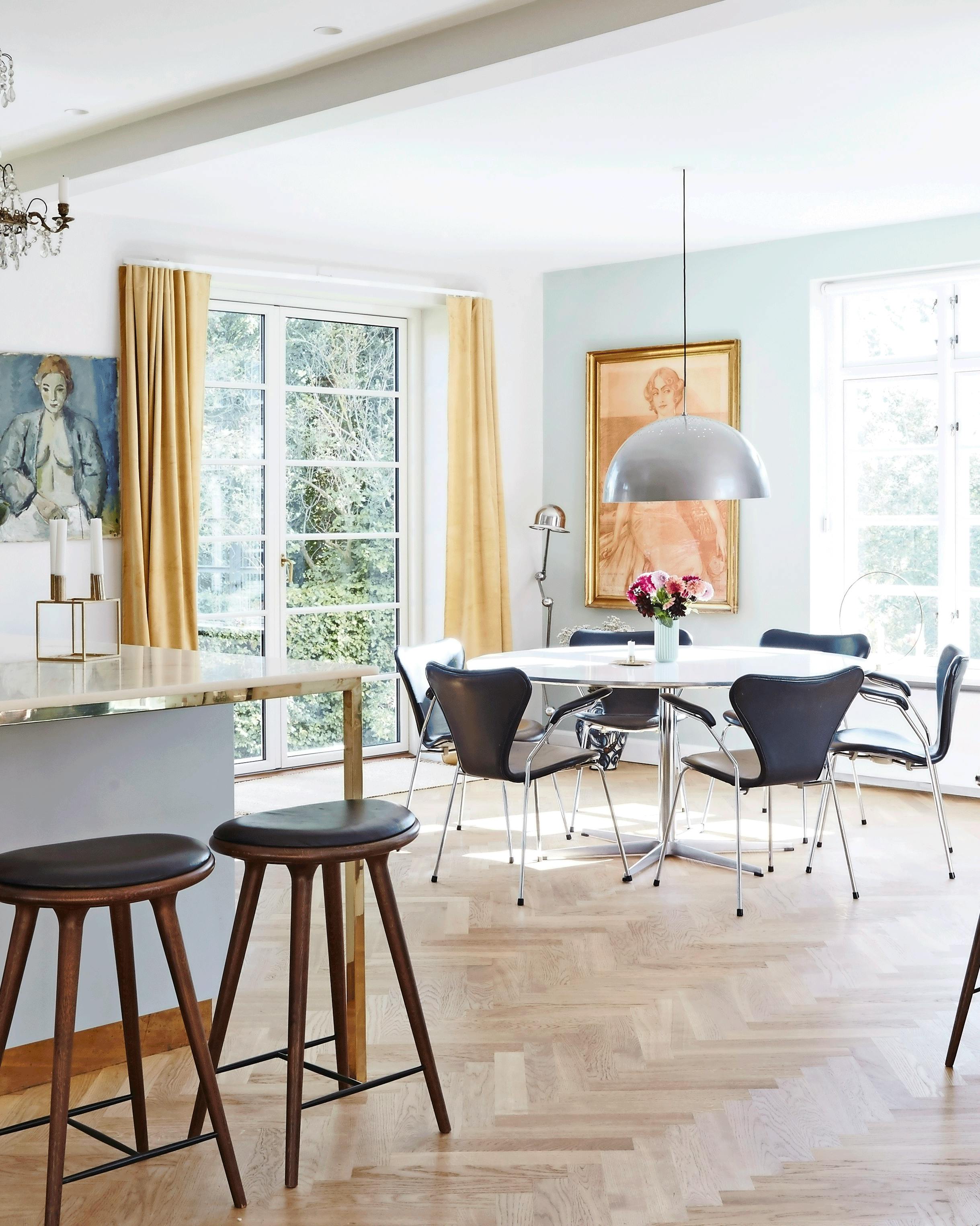 Syveren, også kaldet 7’er-stolen, designede Arne Jacobsen i 1955, og den var med de ni lag formstøbt finer nyskabende. Han stod også bag spisebordet her. Den turkise vase er fra Lyngby Porcelæn, og lysestagen i messing er fra Georg Jensen. Spisebordslampen er fra Mater, og gardinerne er fra Ellos Home. Endevæggen er malet i farven Light Blue fra Farrow & Ball.