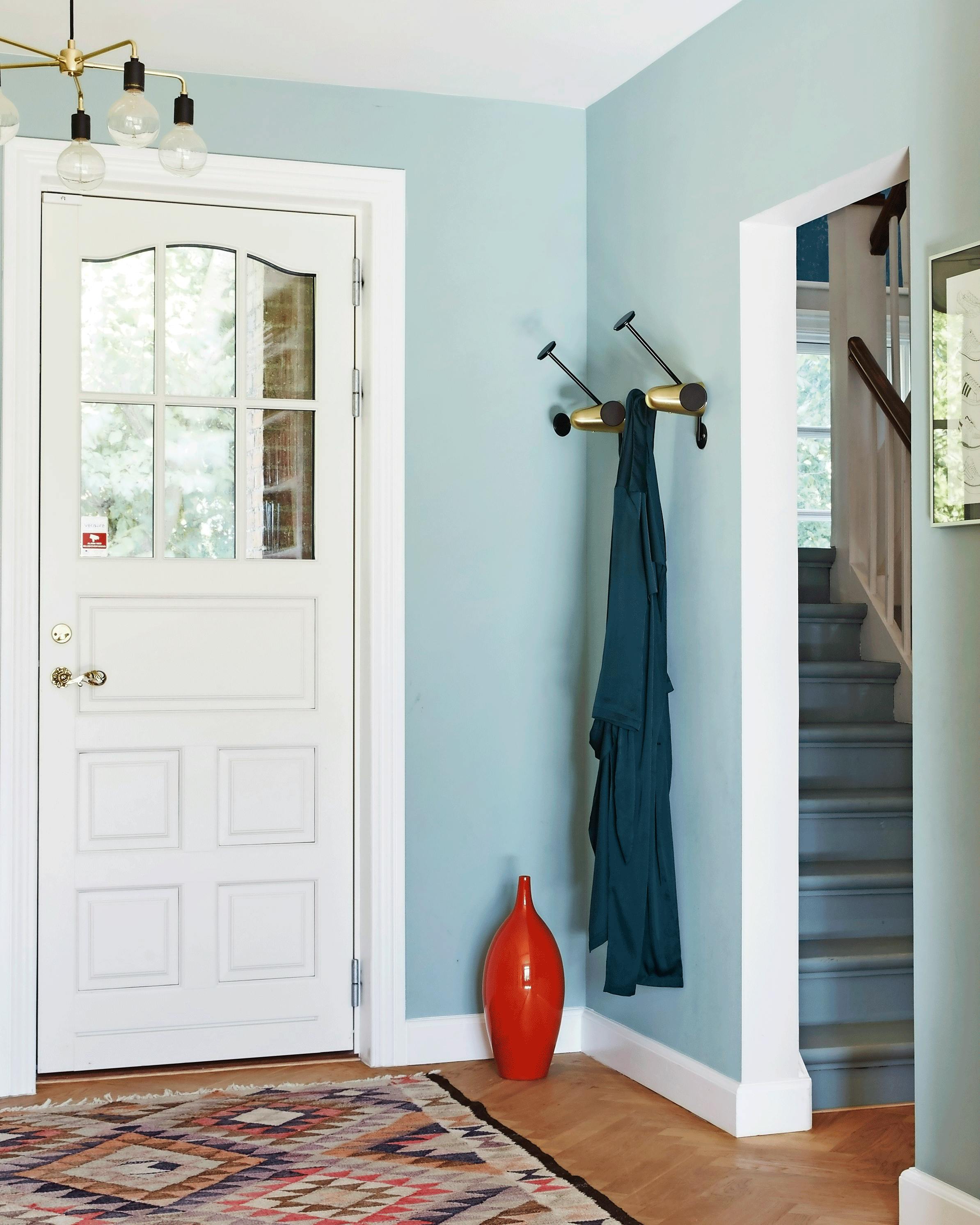 Knagerække fra Gubi og tæppe købt hos Lauritz.com. Den røde vase er et genbrugsfund fra New York, og væggene er malet med Dix Blue fra Farrow & Ball.