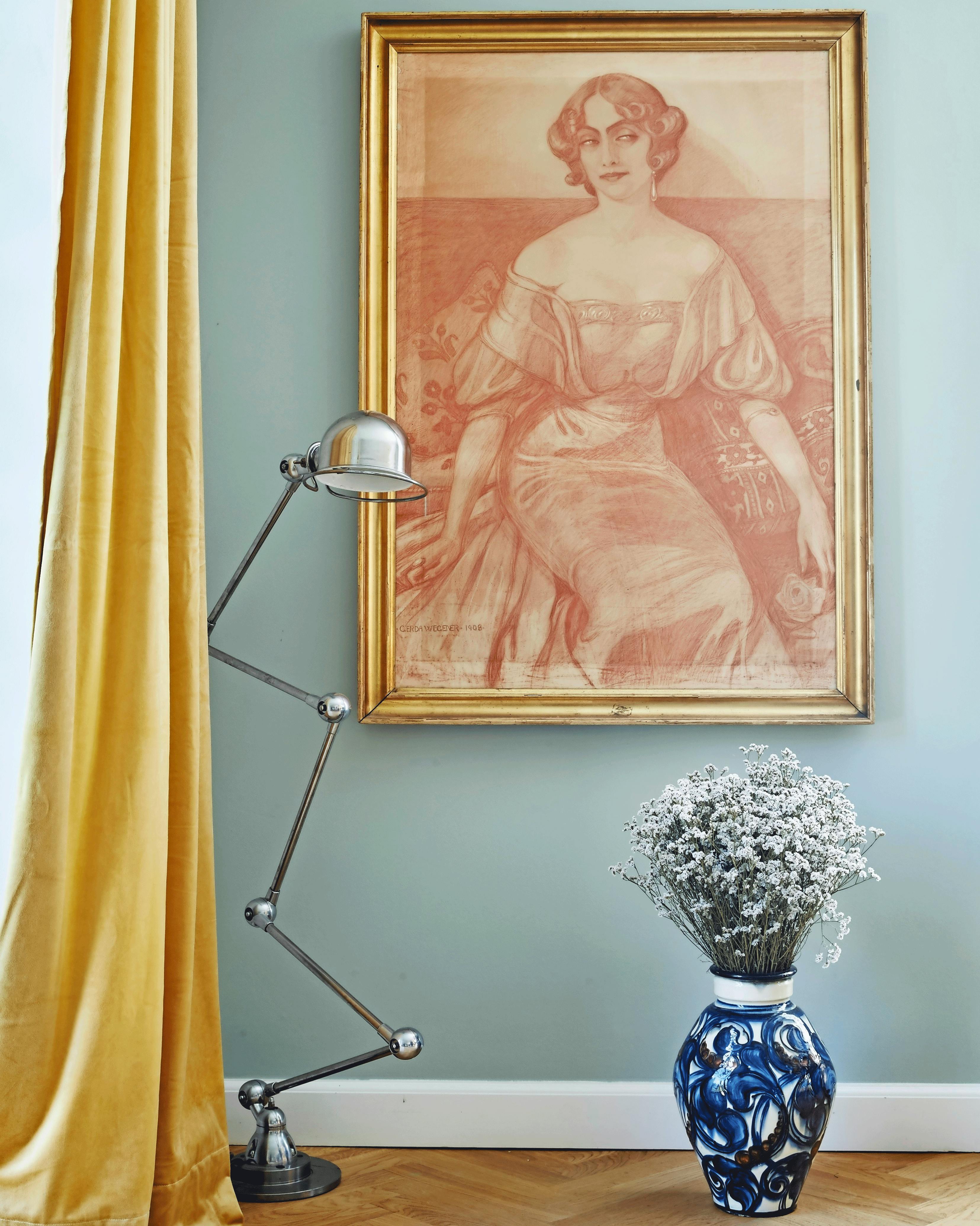 Store malerier kan komme endnu mere i fokus ved at blive hængt langt nede på væggen. Normalt er den gyldne regel, at billeder skal hænge med midten i øjenhøjde, så en tredjedel er over og to tredjedele under synshøjden. Lampen er fra Jieldé.