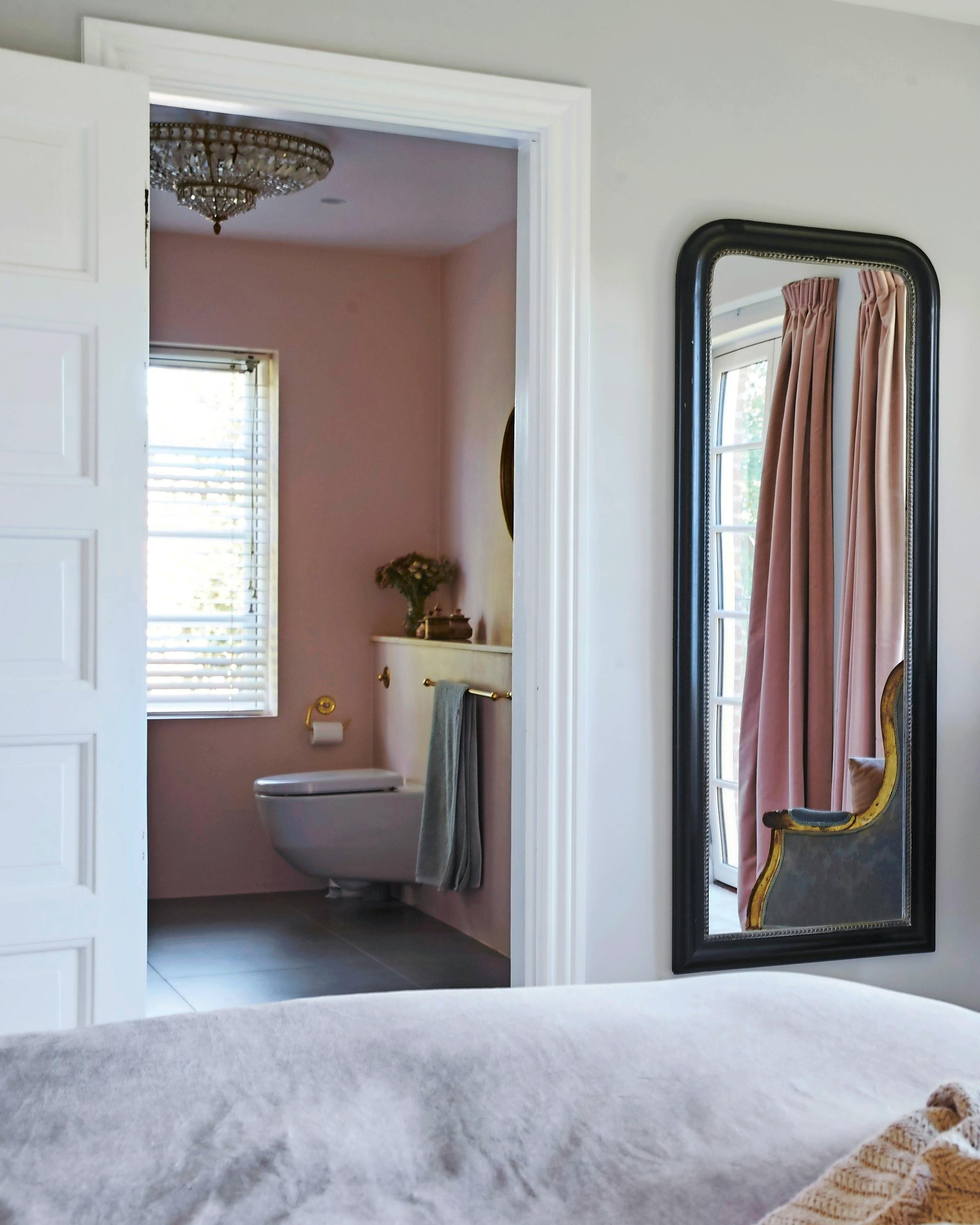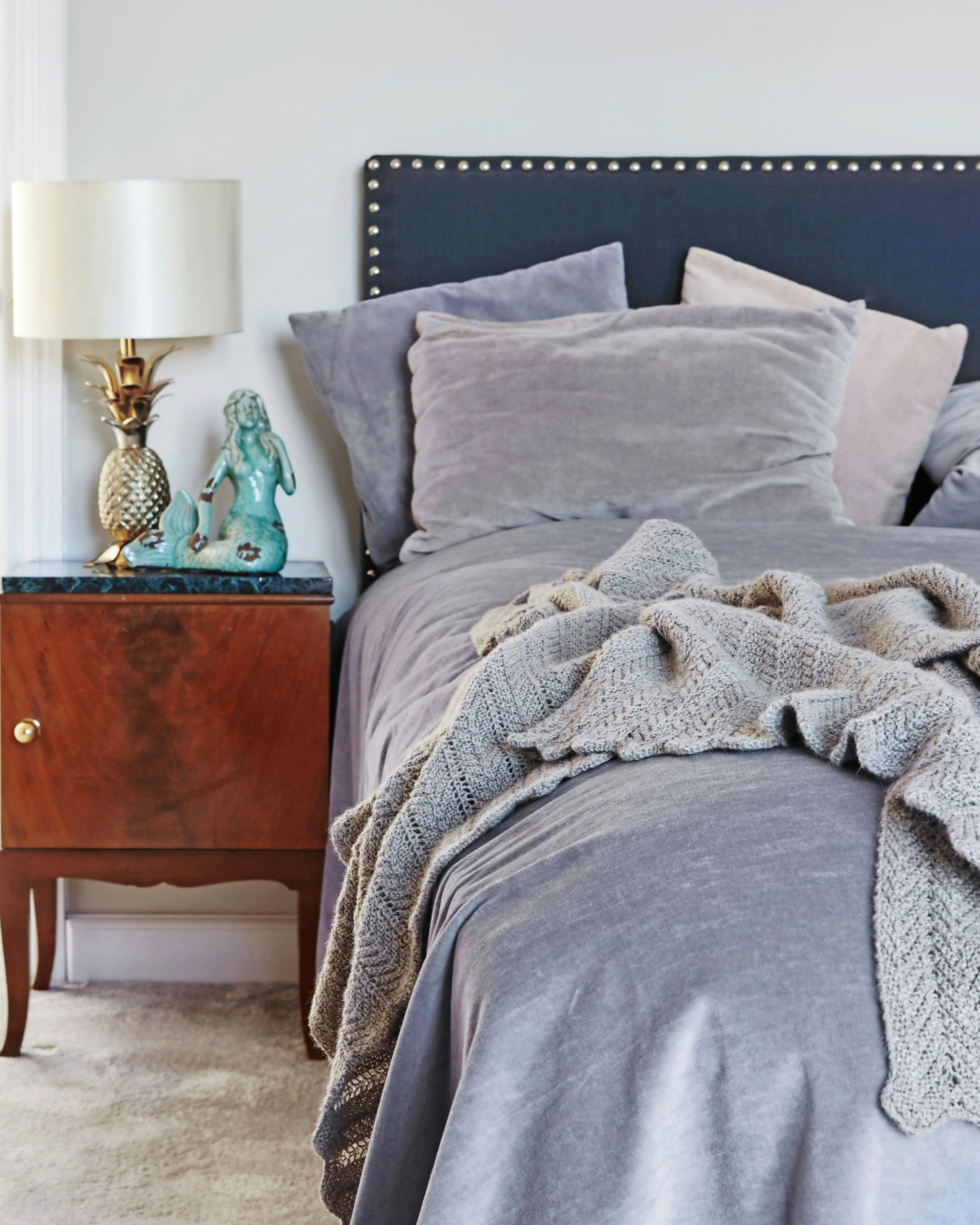 Puder i samme nuancer kan give sammenhæng mellem rum i flere farver. Puder og sengetæppe fra Holkenberg Gardiner, plaid fra Aiayu og bordlampe fra Zara Home. Sengebordet er et arvestykke, og havfruen er købt hos Beau Marché. Væggen er malet i farven Ammonite fra Farrow & Ball.