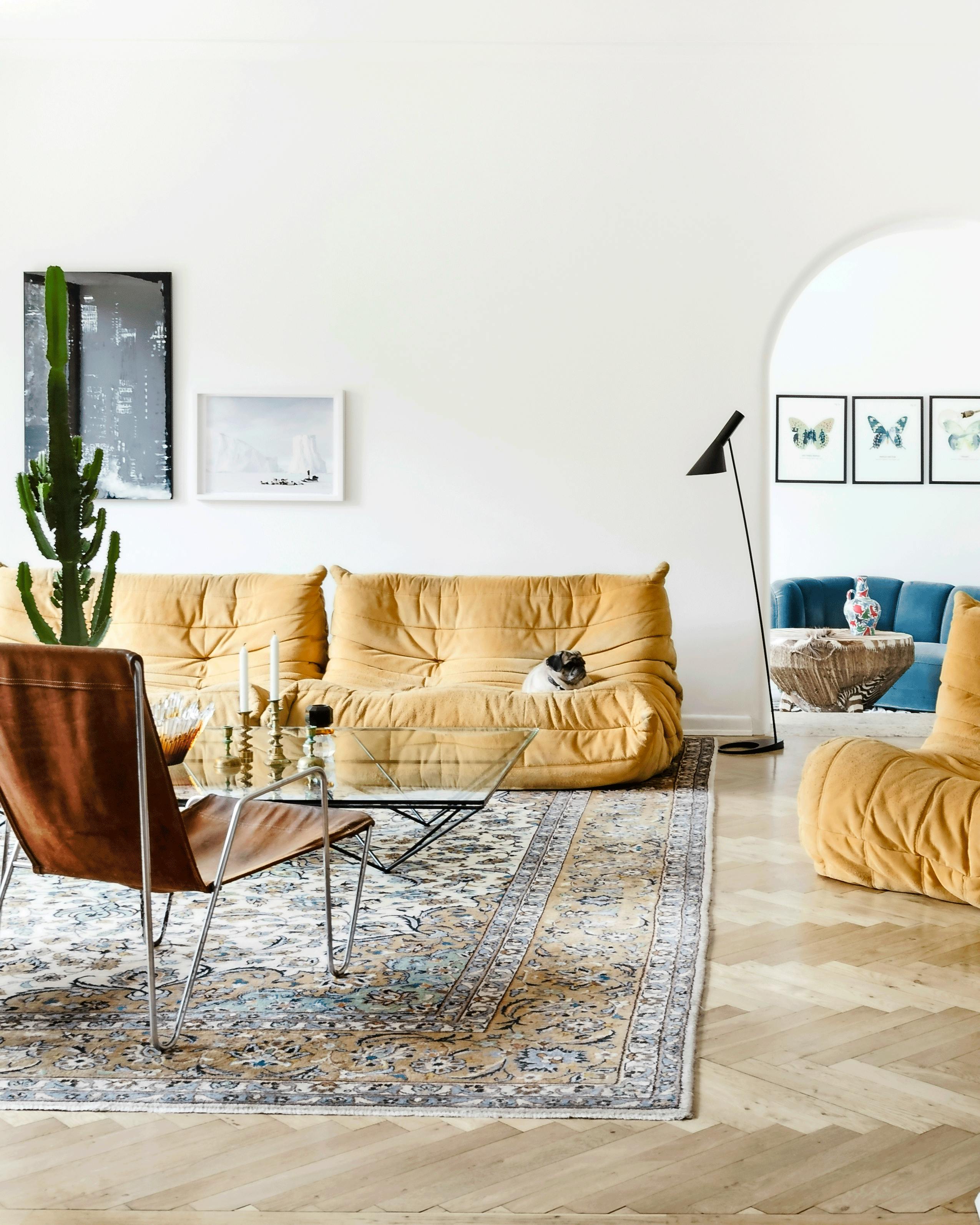 Sofa fra Bolia og sidebord fra Piet Hein Eek hos The Apartment. Velourpude fra Søstrene Grene, printet vintagepude og uldplaid fra Elvang. Lamperne er vintagelamper, som har hængt over petanquebaner i Frankrig. Gulvtæppet er fundet på Lauritz.com.