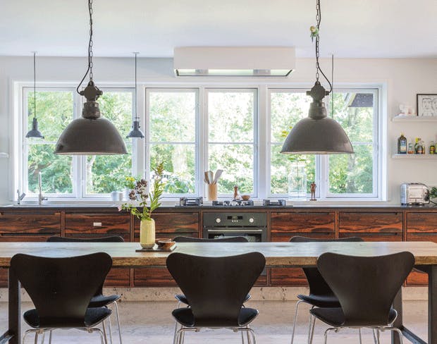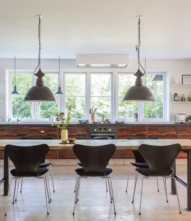 −En af mine helt store favoritter er Flaglinestolen af Hans J. Wegner, som vi har stående i vores stue. I køkkenet er mit bedste køb vores spisebord. Det er smukt og har en sjov historie. Bordets understel stammer nemlig fra en nedlagt fabriksbygning i Berlin, hvor vores ældste datter boede, da vi købte det, siger hun.