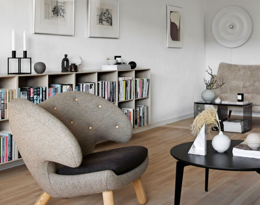 Finn Juhls Poeten er bare en af mange møbelklassikere, som Marianne Jacobsen har indrettet sit hjem i Risskov ved Århus med. Hun har nøje udvalgt dem, og de skal helst kunne holde i mange år, så derfor vælger hun dem i afdæmpede farver.