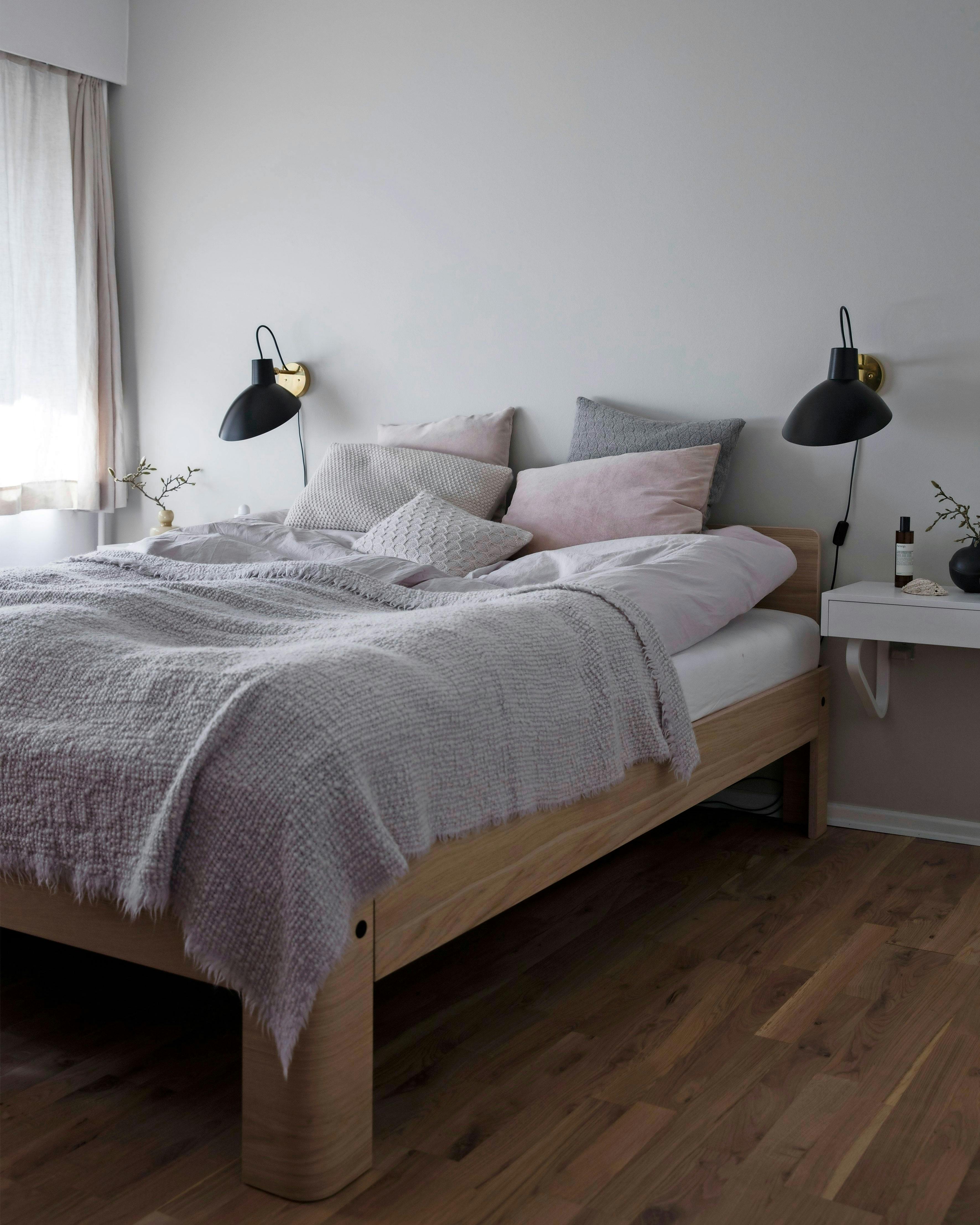 Bløde puder og tæpper i støvede farver gør soveværelset blødt og indbydende, også selvom omgivelserne er minimalistiske. Sengebordet er designet af Alvar Aalto, sengen er fra Auping og lamperne fra Astep.