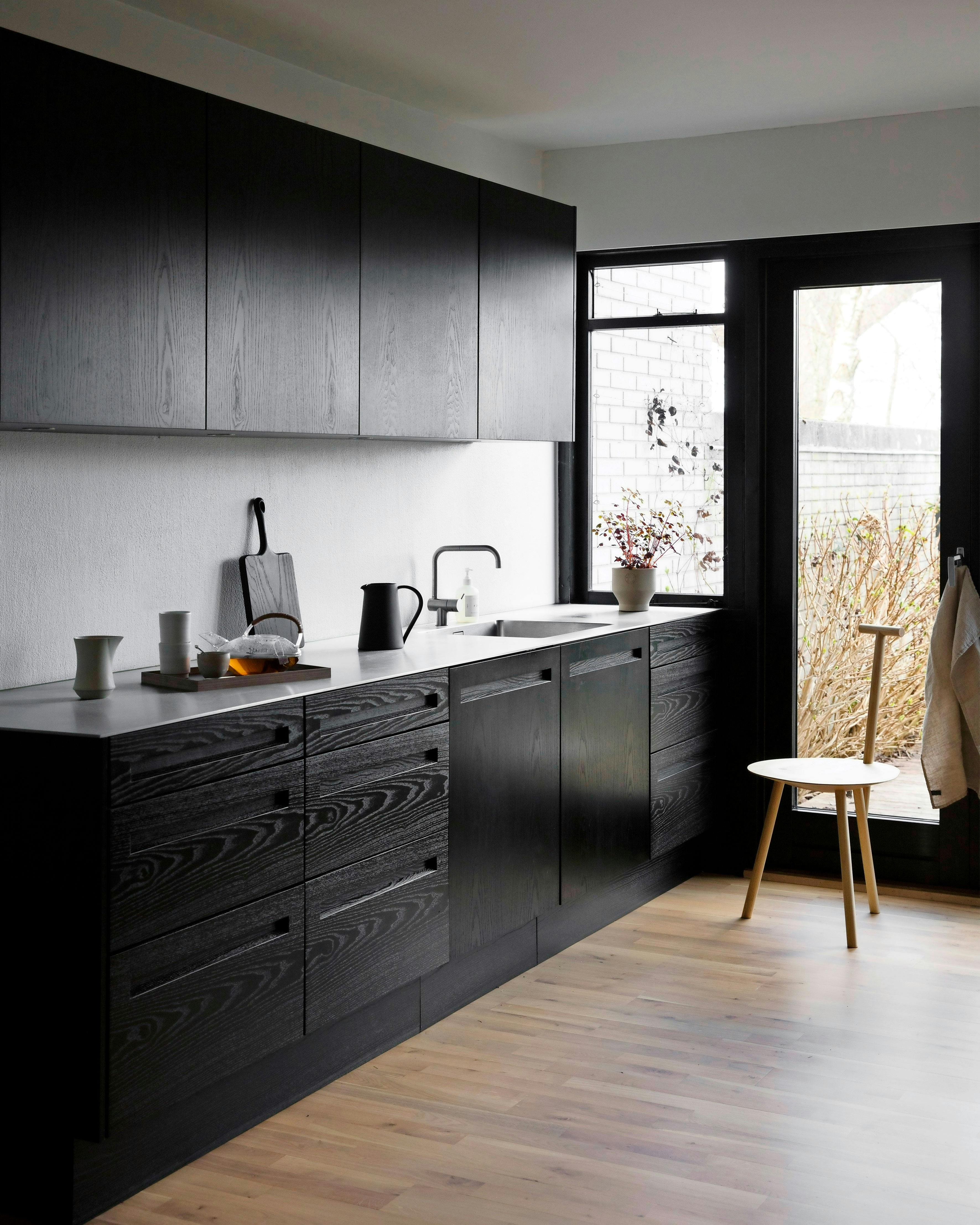Et sort køkken kan hurtigt blive meget mørkt, så det kan være en god idé at holde omgivelserne lyse og bløde køkkenet op med træ og keramik. Køkkenet her er fra Hanstholm.