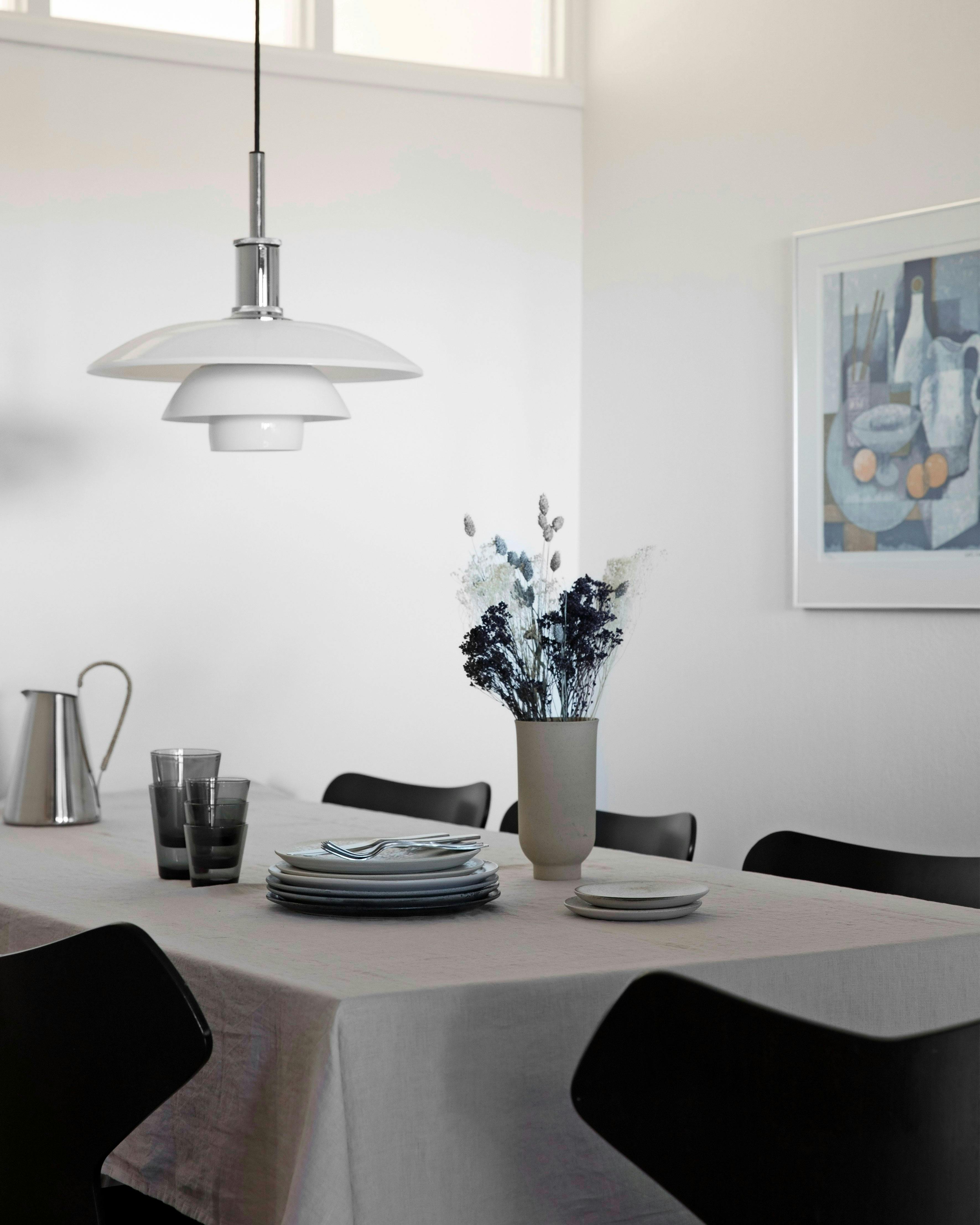Poul Henningsen var både journalist, kulturkritiker og revytekstforfatter, men i dag nok bedst kendt som arkitekt og for lamper, han designede i 1920'erne. Her hænger en af hans pendler over et bord fra Kjeldtoft. Kanden er fra Georg Jensen, og stolene er designet af Arne Jacobsen.