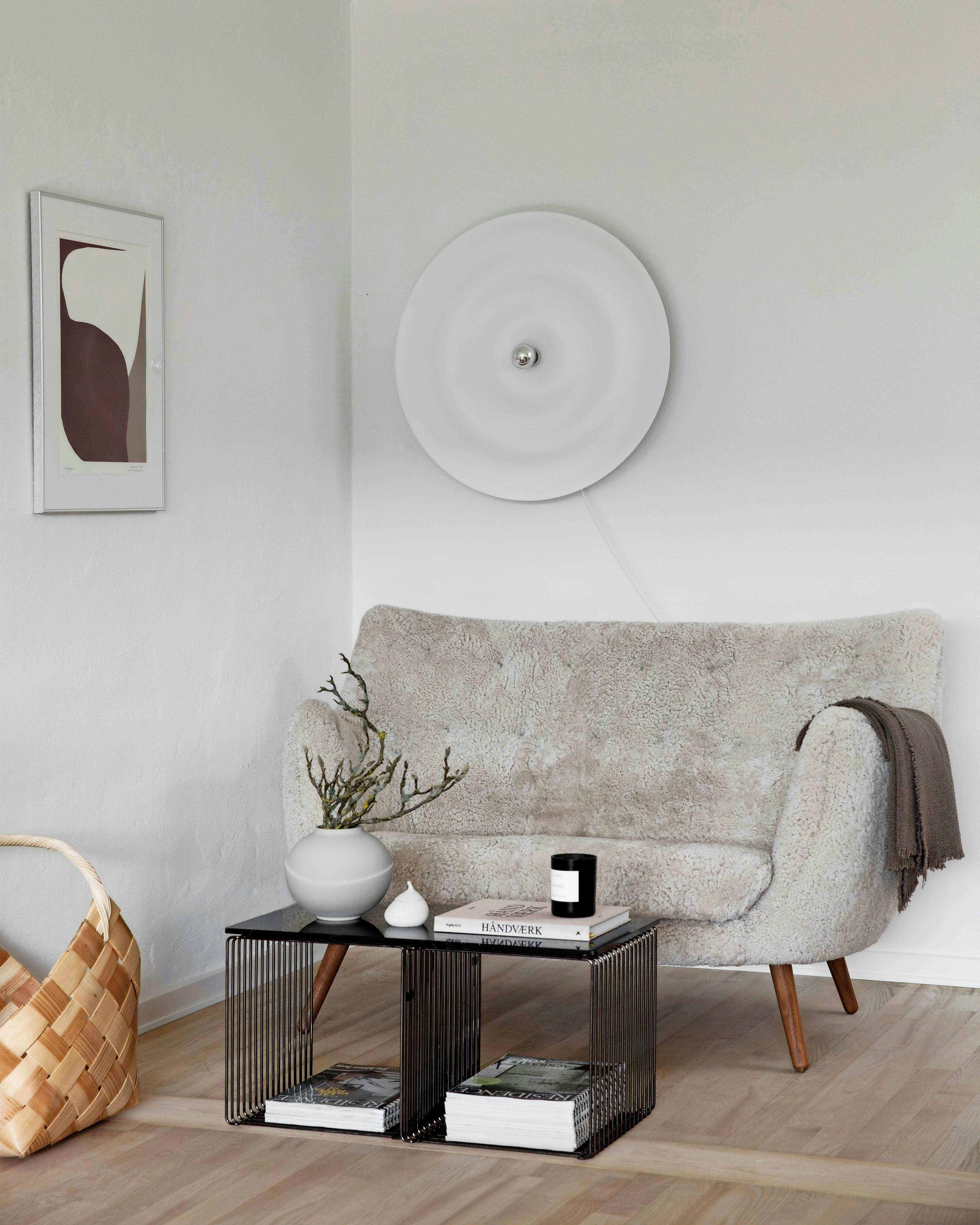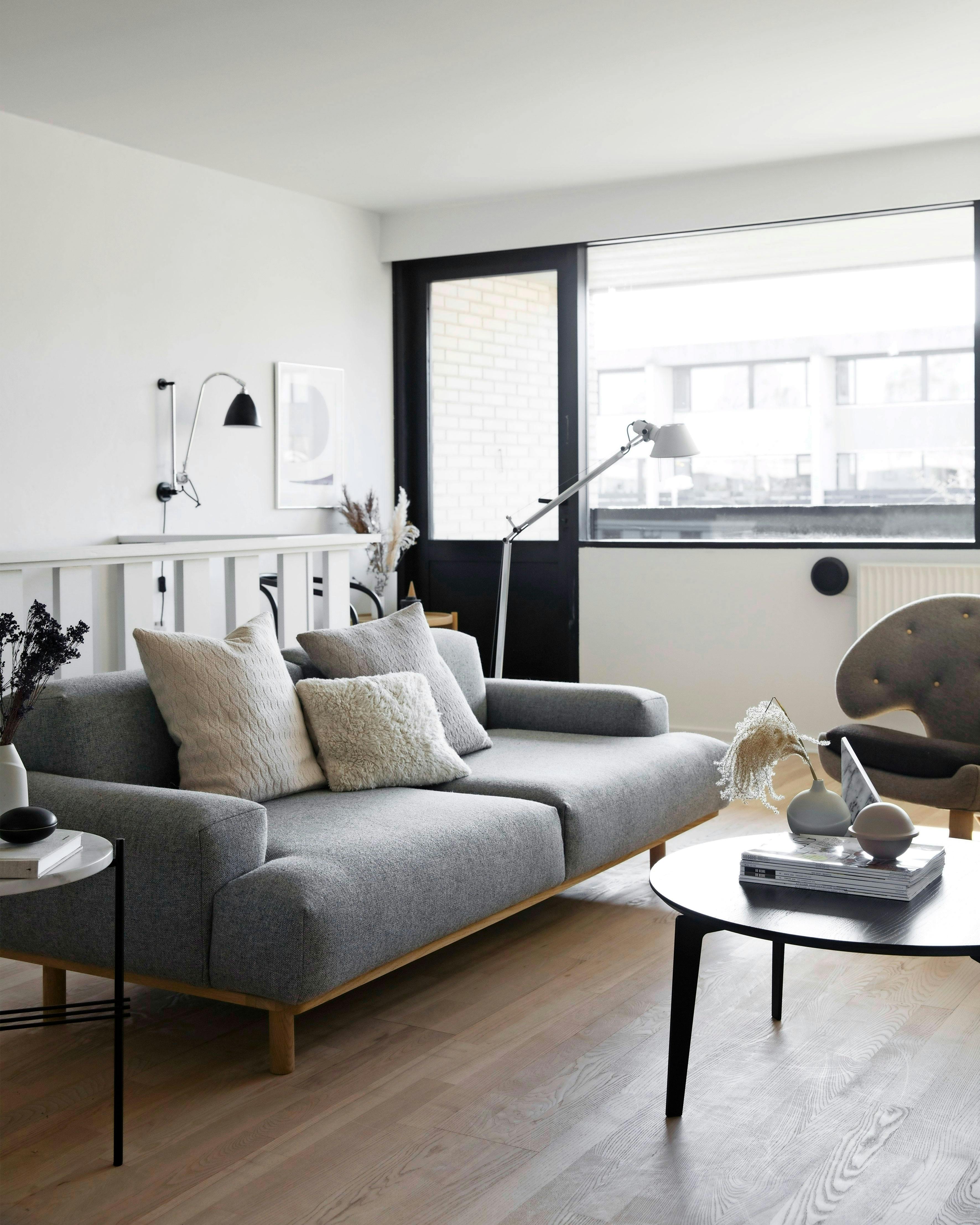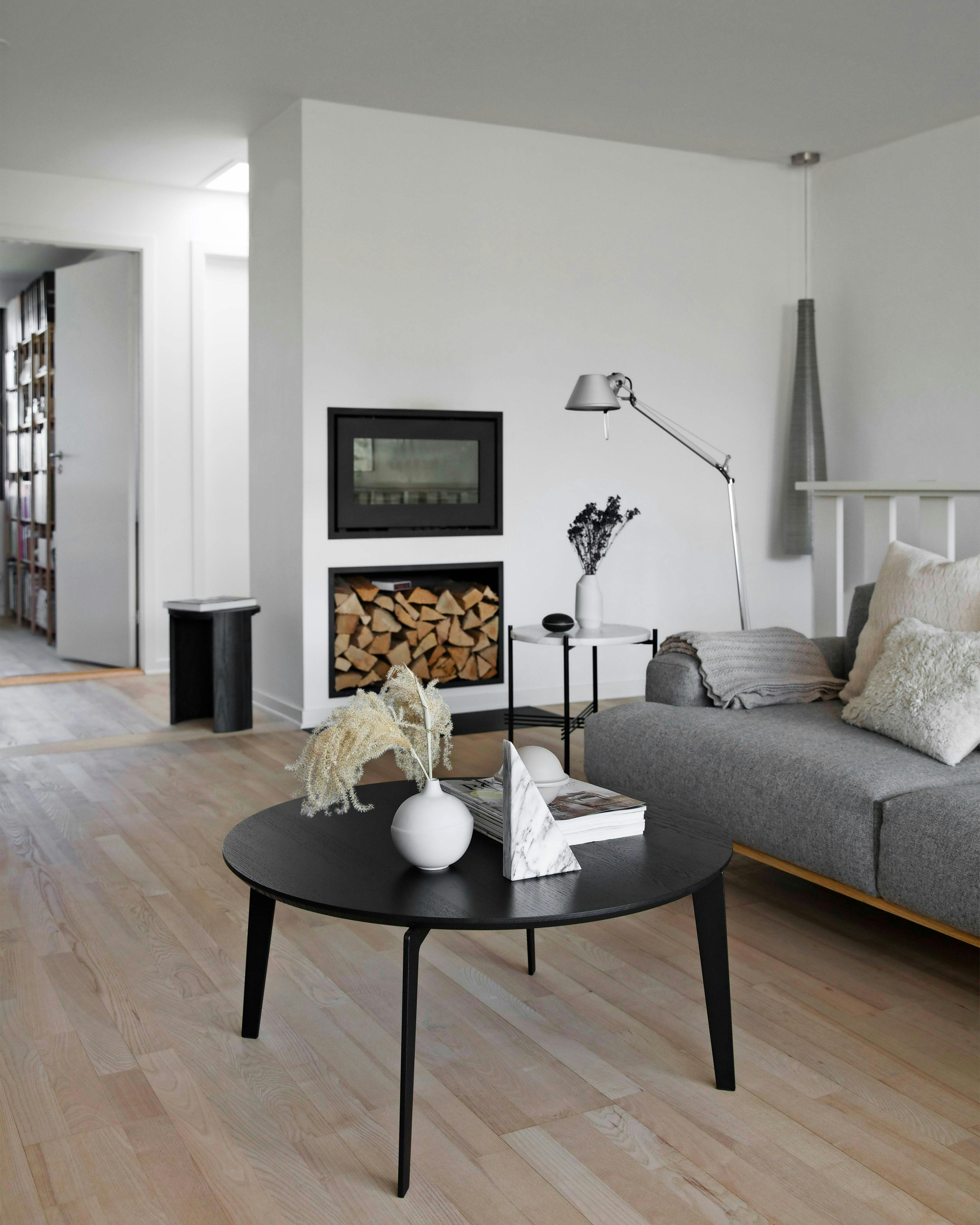 Hvorfor nøjes med et sofabord foran sofaen? Stil din tekop fra dig på et lille sidebord – så er den meget nemmere at nå, når du har benene smækket op i sofaen. Sidebordet her er designet af GamFratesi for Gubi, sofabordet er fra Fritz Hansen og sofaen fra Bruunmunch.