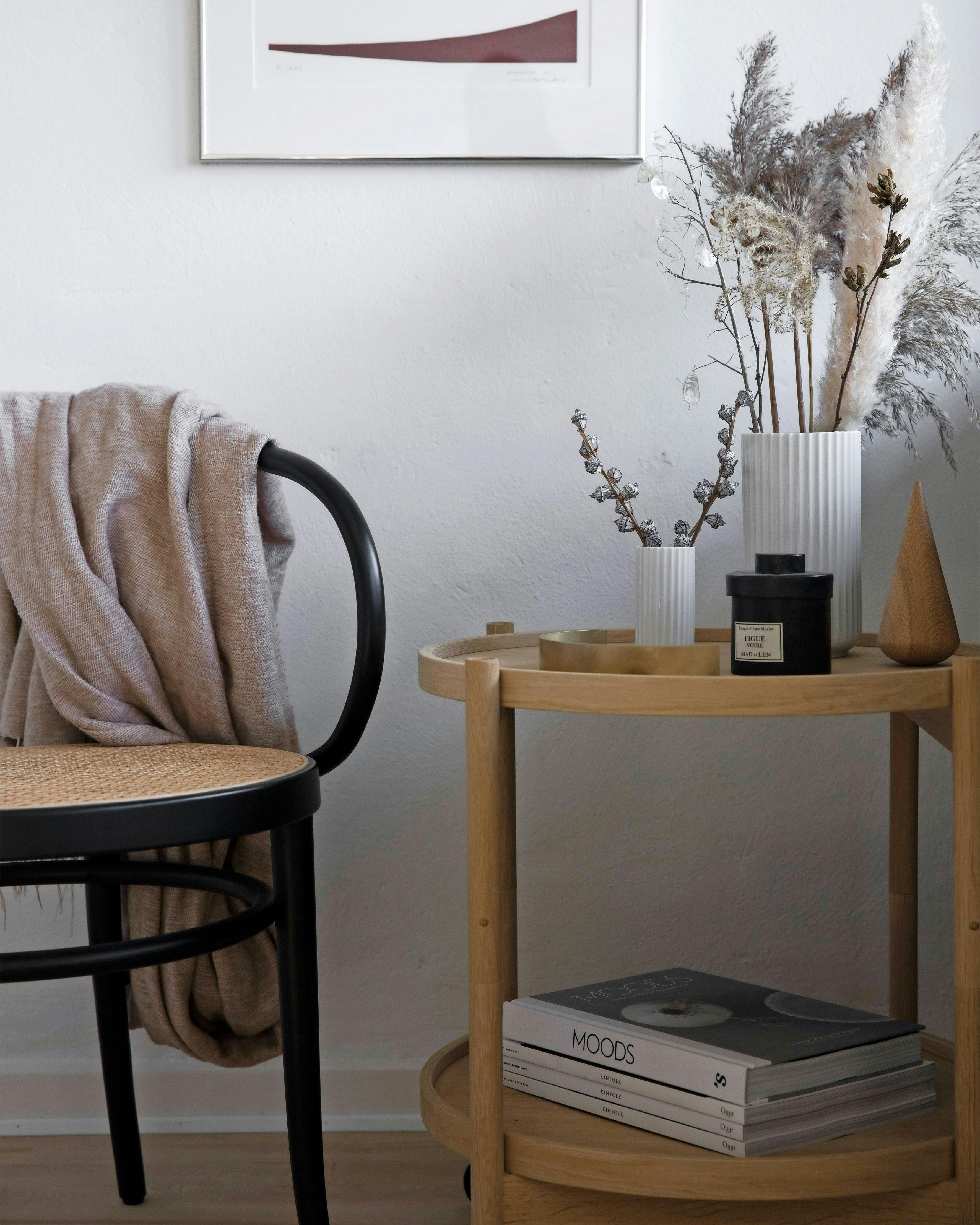 Grene og tørrede blomster er en god måde at invitere naturen ind i hjemmet på, hvis du ikke vil have farverige buketter stående. Sofaen er designet af Finn Juhl, sofabordet er fra Montana, og væglampen fra Wästberg.