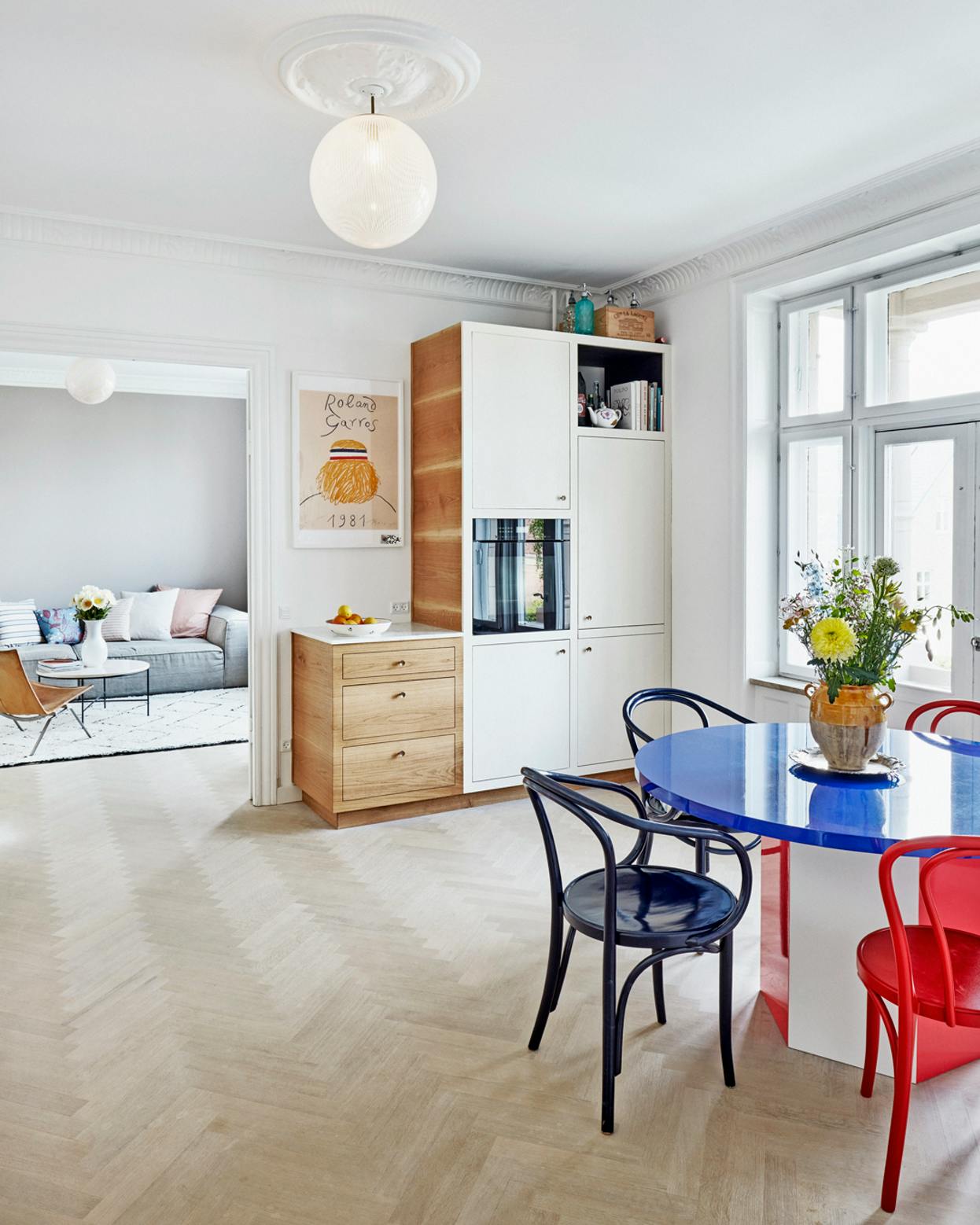 De to retro-stole omkring det runde bord giver herskabslejlighedens højloftede køkken en afslappet kant. Køkkenet er bygget op omkring den gamle grundplan og med de samme gamle fliser, som altid har siddet i rummet. Skabet på væggen er et gammelt postskab, og lamperne er fra Ebb & Flow.