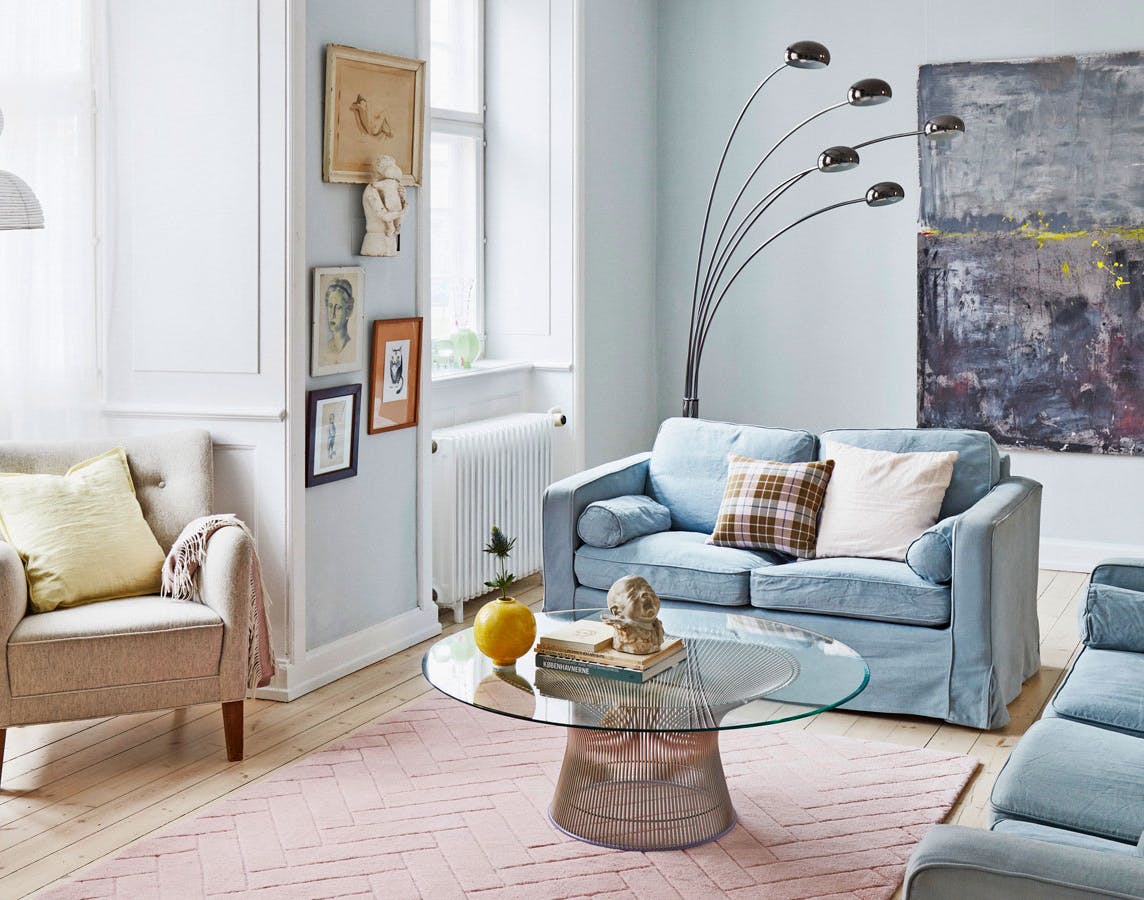 Den pastelfarvede indretning nærmest flirter med herskabsstilen, som lejligheden blev født med for 100 år siden, og man fornemmer, at Eva-Marie Wilkens glæde ved det moderne formsprog går hånd i hånd med respekten for det oprindelige.