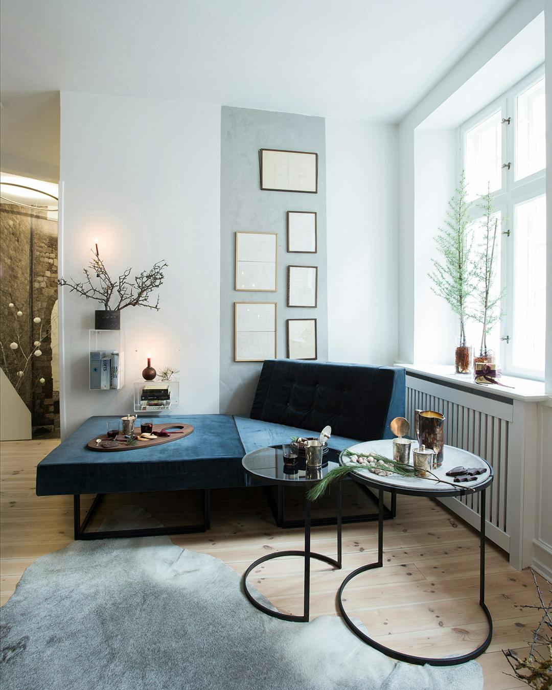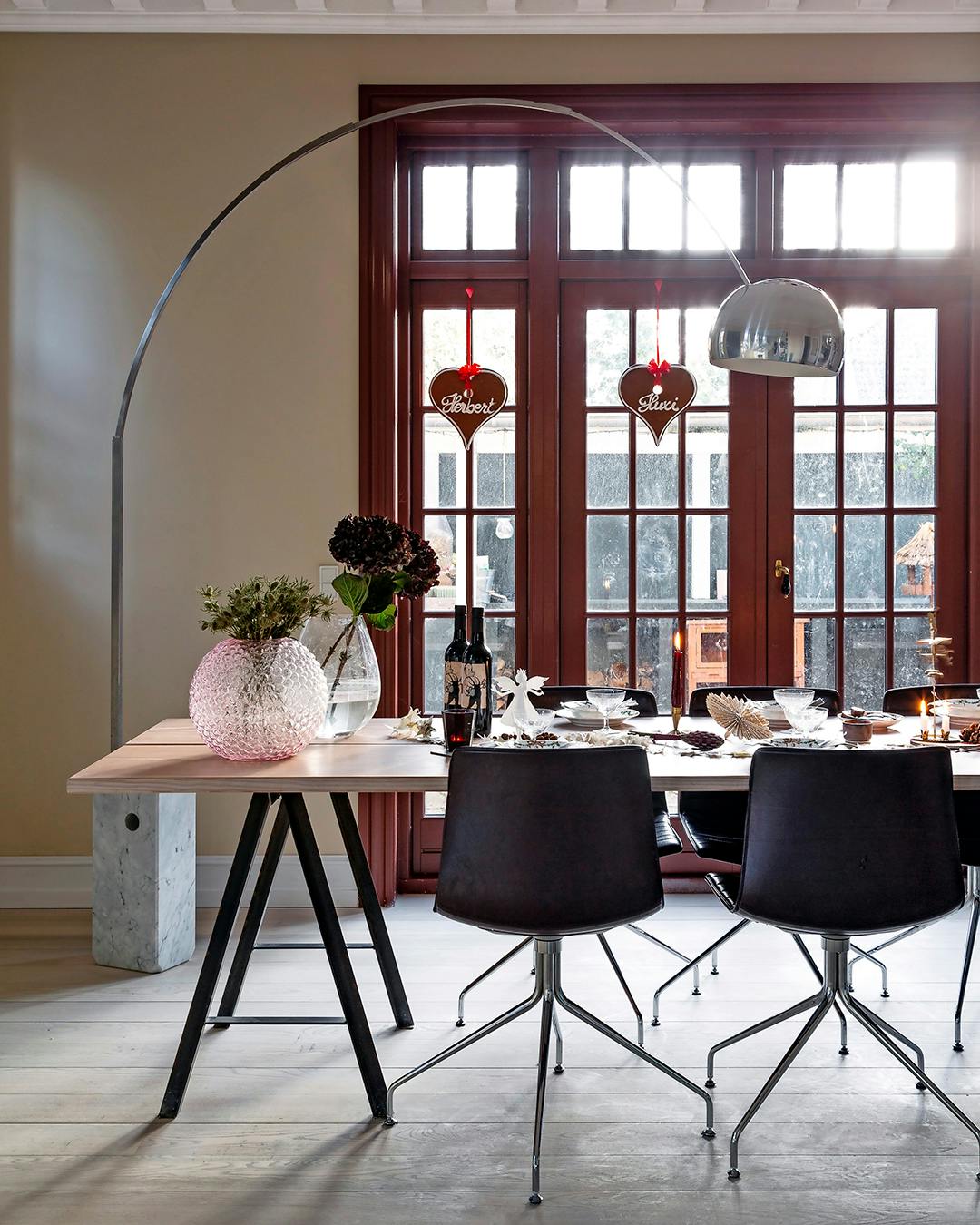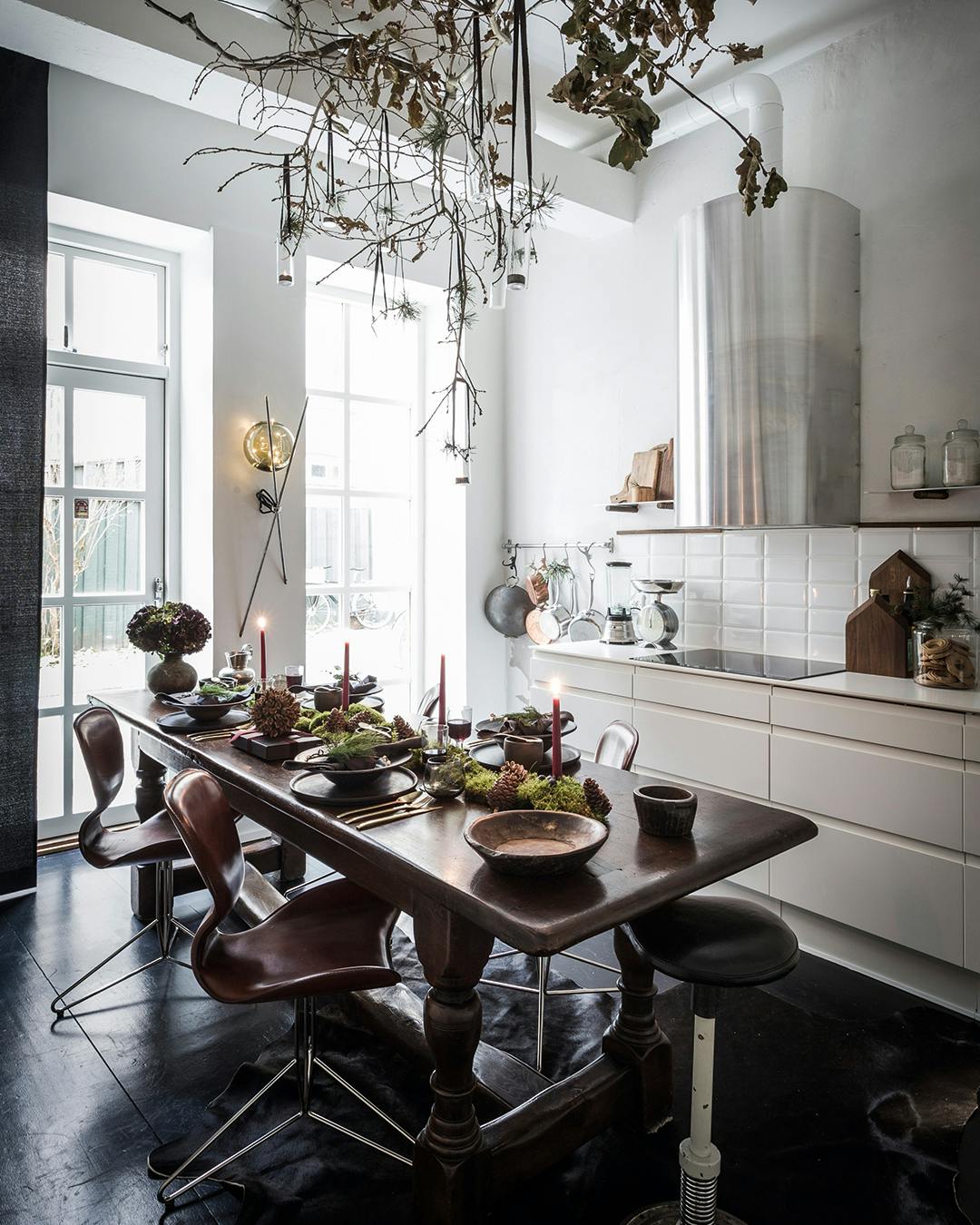 Til jul bliver stilen endnu mere nordisk ved hjælp af naturlig pynt i vindueskarme, i gulvvaser og på bordene.