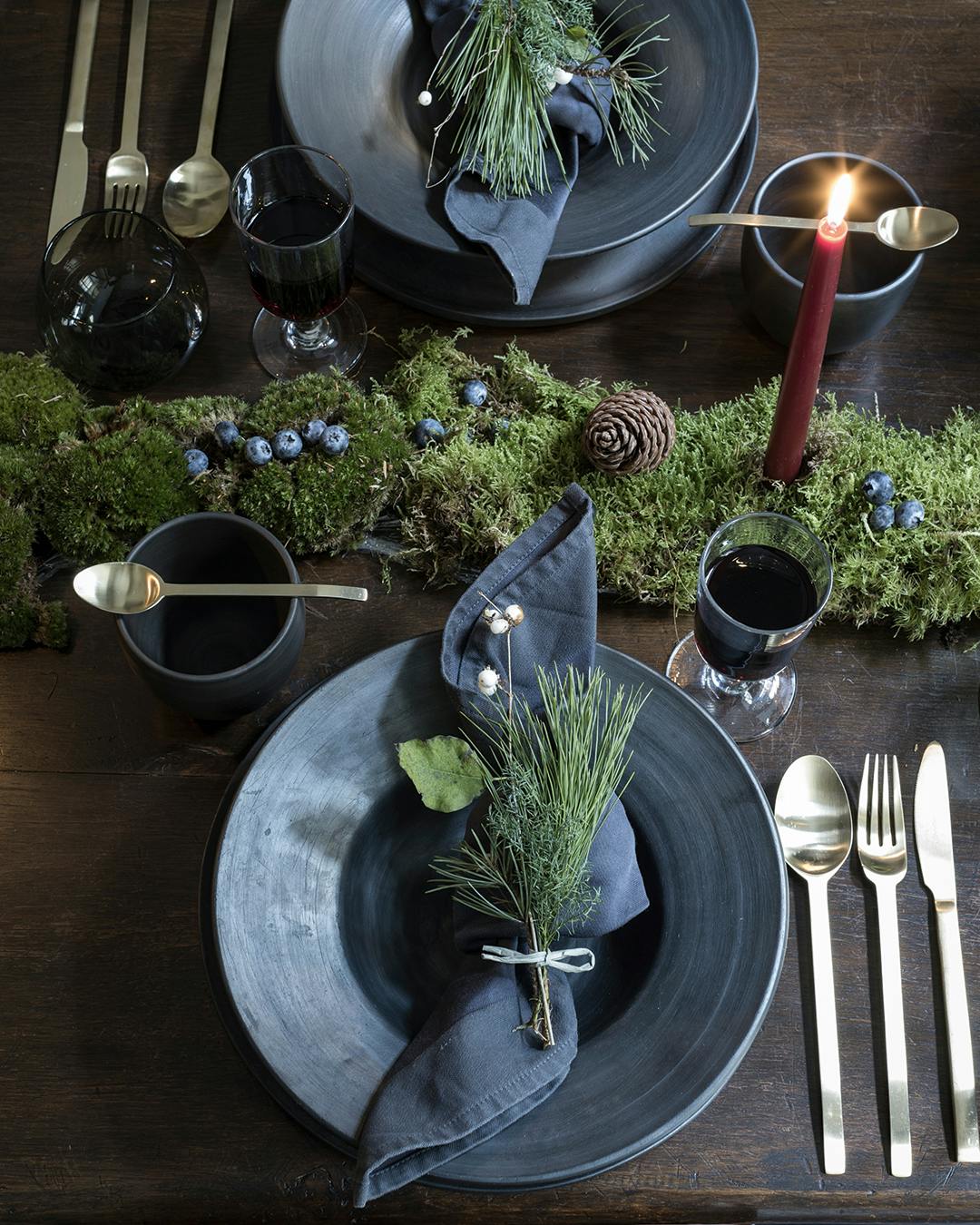 Skab illusionen af skovbund ved at lægge frisk mos ned gennem bordet på film eller stanniol, og brug kogler og blåbær som pynt. De røde stearinlys fra Broste er sat direkte i den fugtige mos. Bordet er dækket med sort stentøj fra Rue Verte, guldbestik fra Ilva, arvede vinglas og grå serviet fra George Jensen Damask.