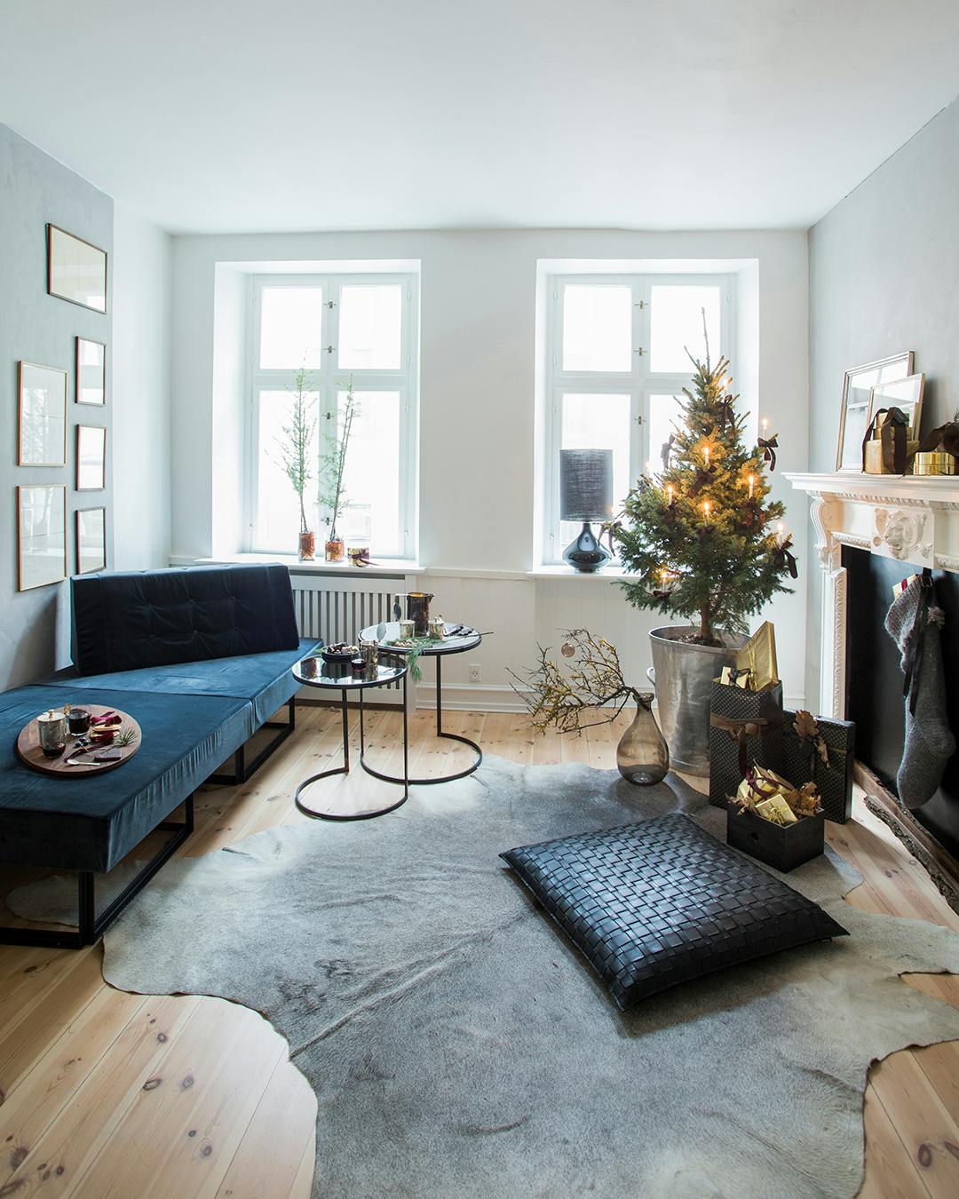 Hvis du ikke vil have et stort træ, men gerne have højde på det, kan du som her sætte det i en spand eller krukke. Slagterspanden er fundet på loppemarked. Lampen i vinduet er fra Rue Verte, den store læderpude er fra Louise Roe, og skindtæppet er fra Natures Collection.