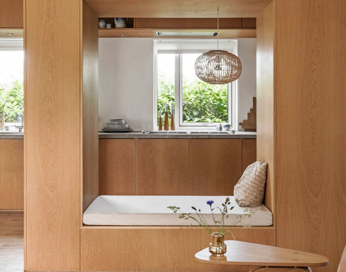 Derfor har Line Frier blandt andet indrettet et indbygget skab mellem køkken og spisestue, som åbner rummene op og samtidig fungerer som siddeplads.