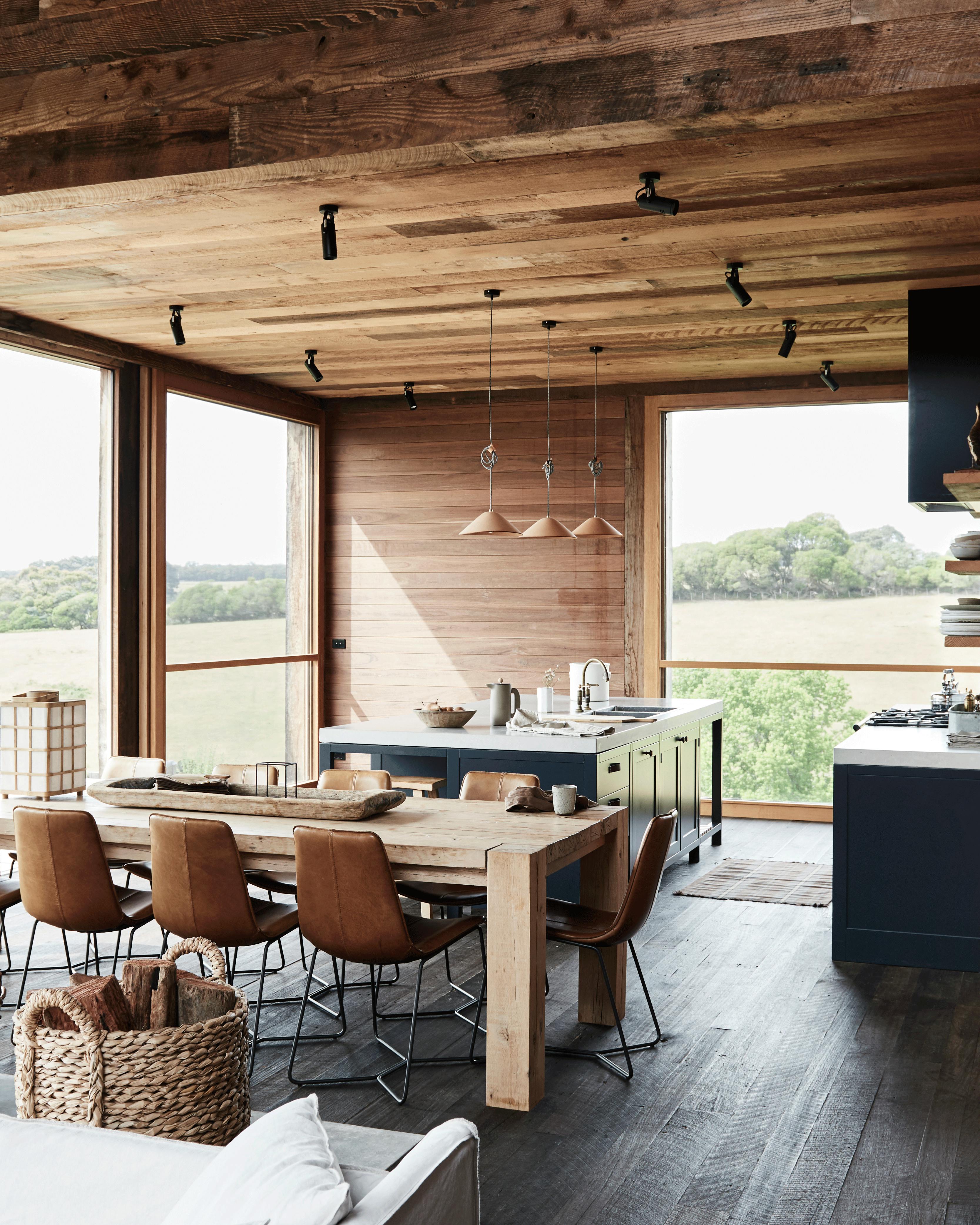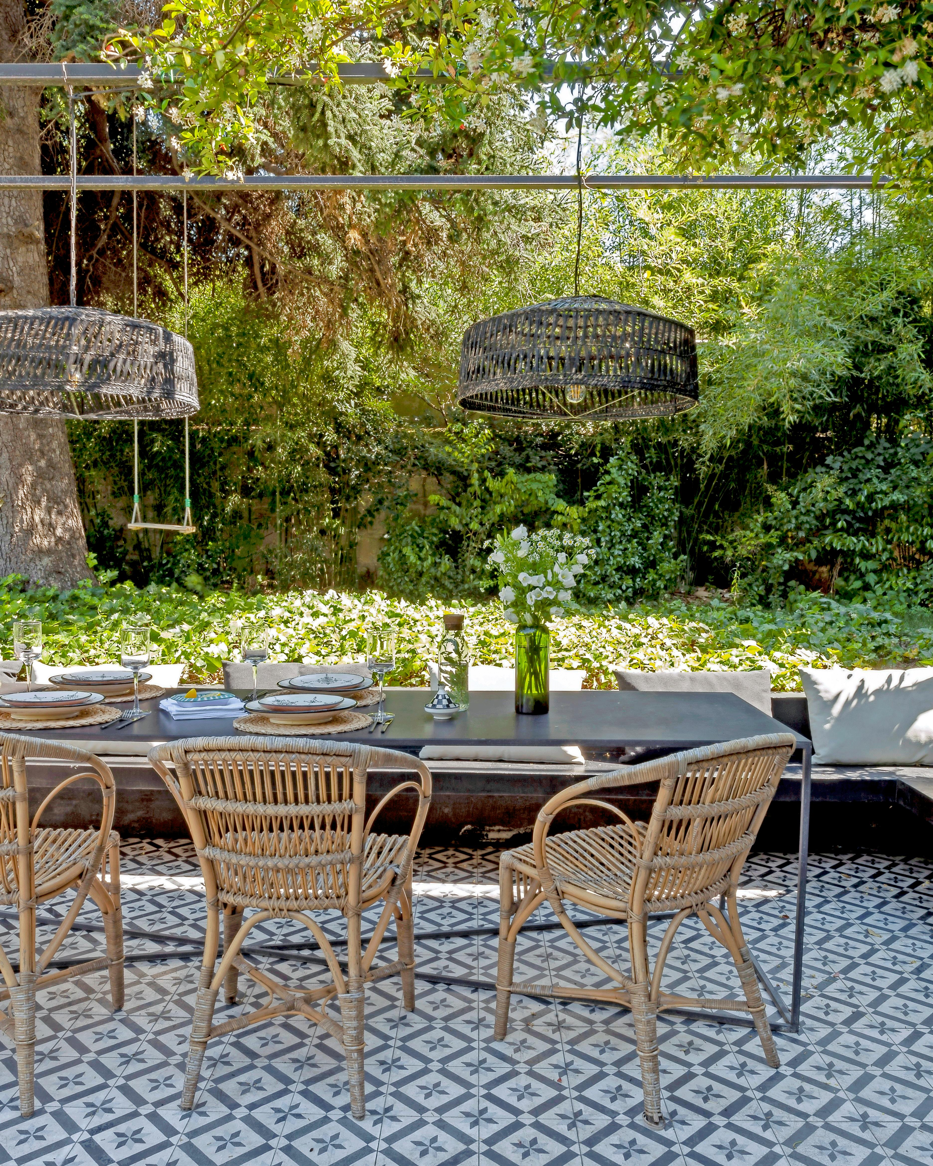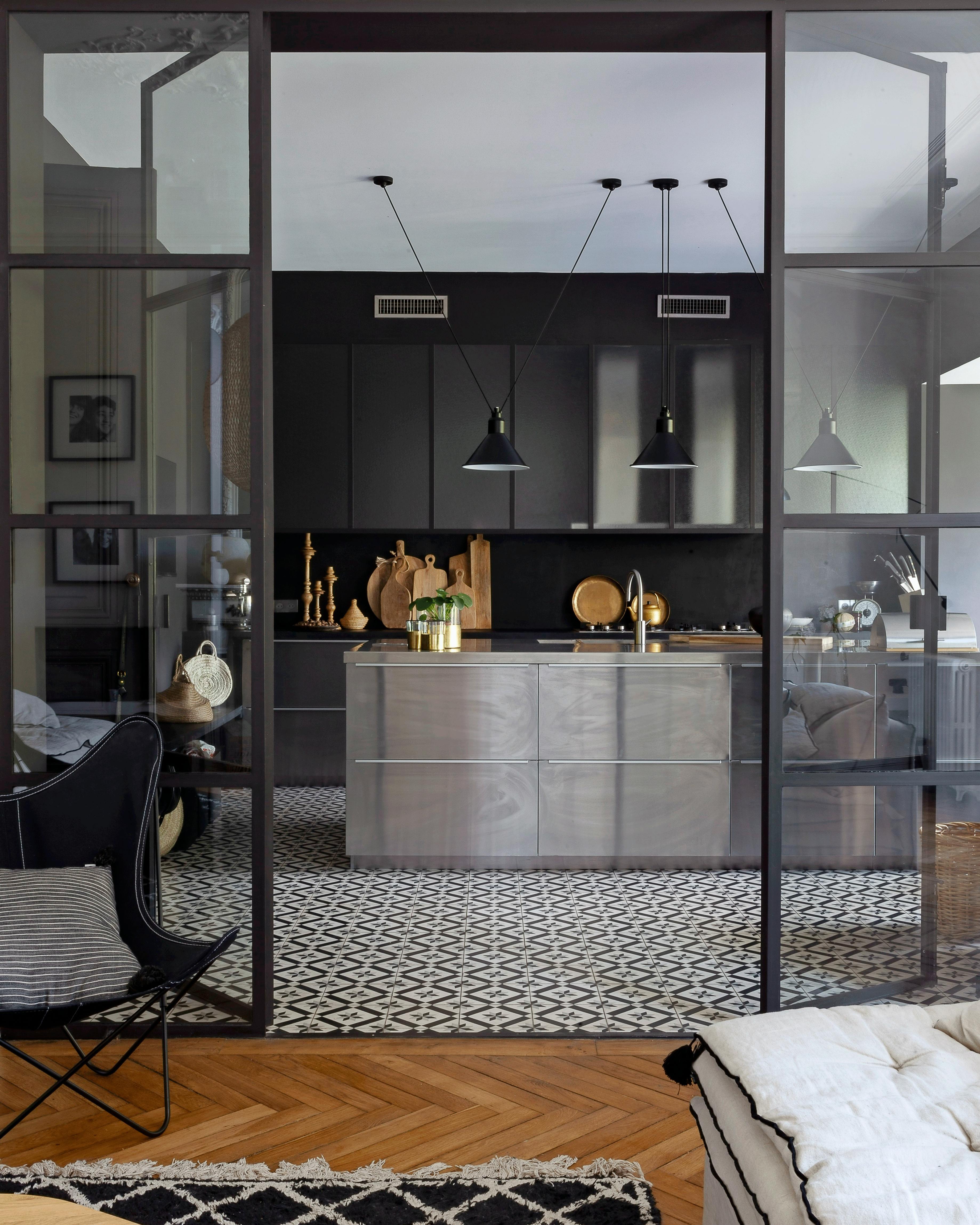 Find fliser, som både kan fås i en indendørs- og en frostsikker udendørsversion, og lad køkkenets gulv gå igen på terrassen. Bordet er speciallavet af Stéphane Degas' firma, Atelier de Steel, og lamperne er fra Cinq Étoiles.