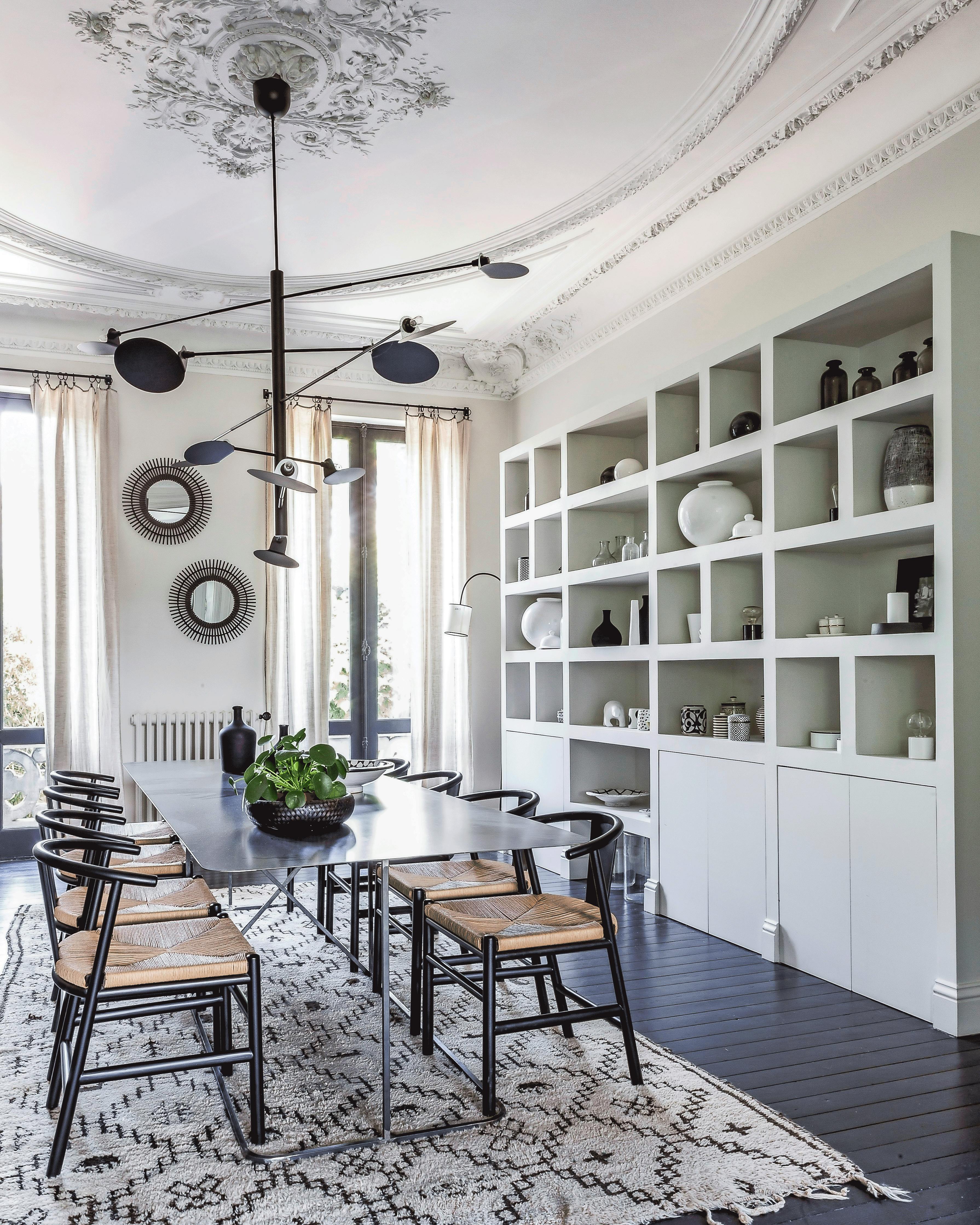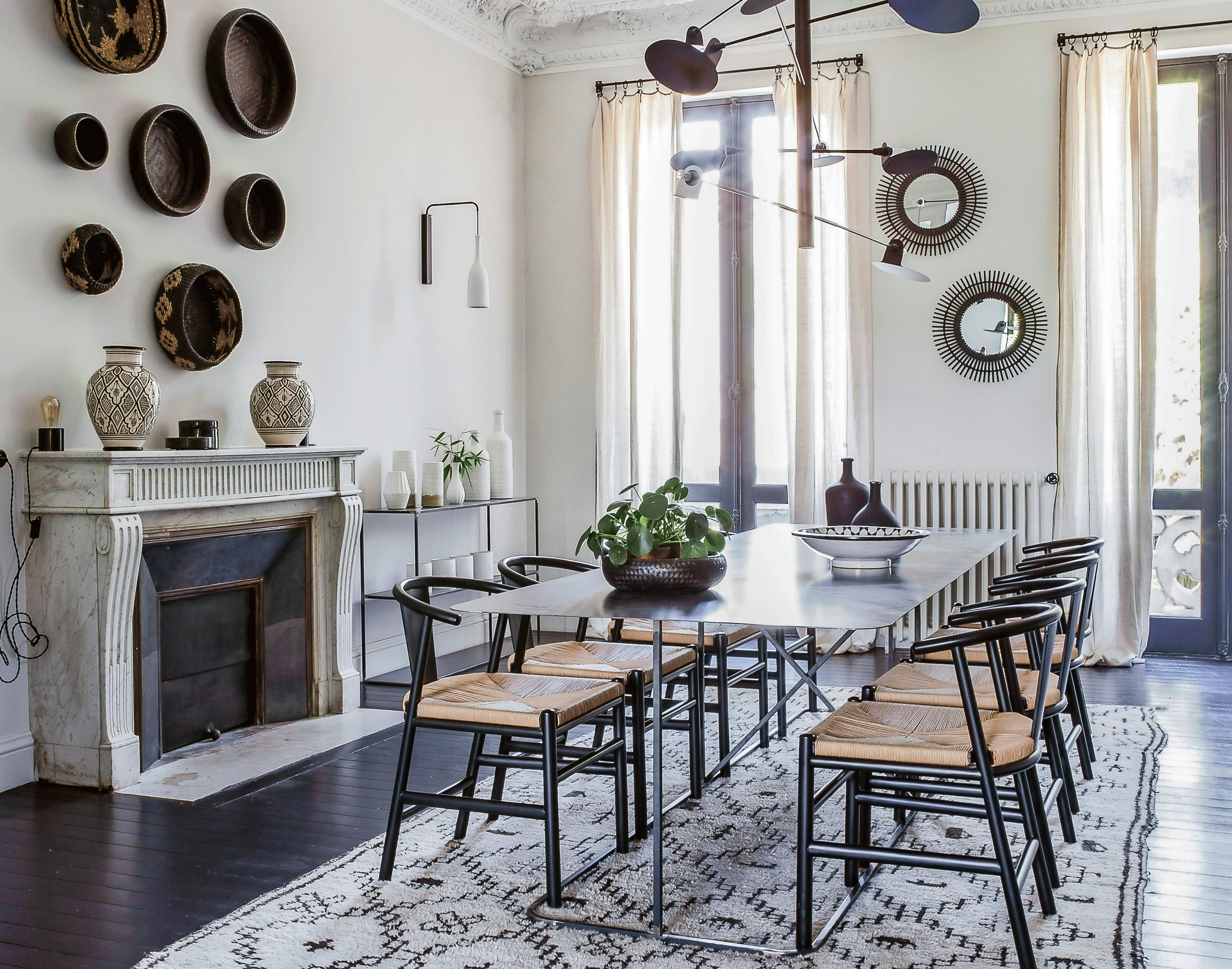 Det marokkanske tæppe under spisebordet er med sin lange luv og sit geometriske, brune mønster på lys baggrund et typisk Beni Ouarain-tæppe. Tæpperne er i flere hundrede år blevet vævet i uld af kvinderne fra berberstammen Beni Ouarain i Atlasbjergene. Spisebordet i stål er specialfremstillet af Stéphane Degas' firma, Atelier de Steel, og stolene er fra AMPM. Loftlampen er fra José Esteves.