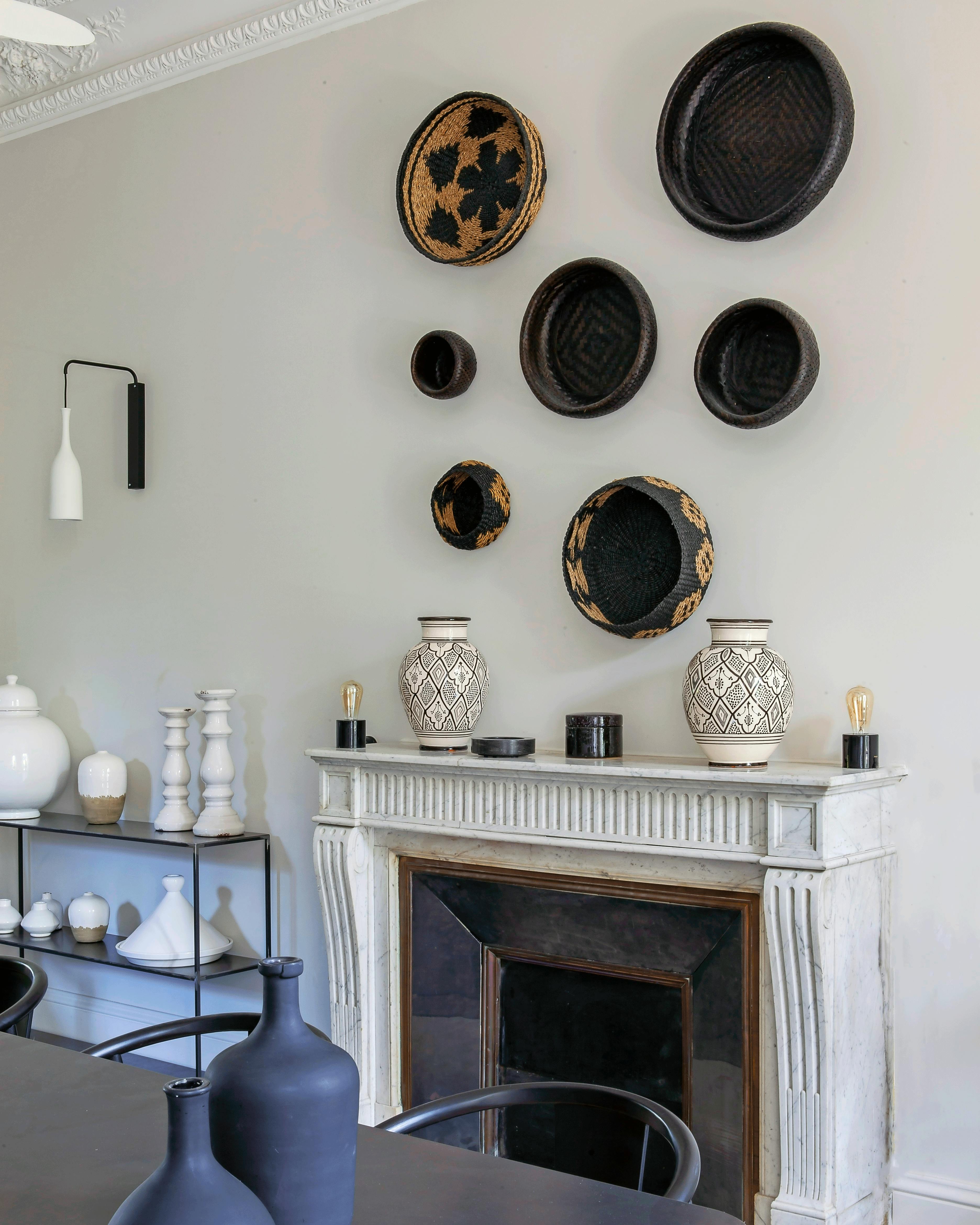 Brugsgenstande som brødkurve kan sagtens fungere som en kunstnerisk dekoration, hvis de kurateres rigtigt. De marokkanske kurve her er fra KOK Maison og PB Home. Væglampen er fra Ludivine Degas' egen interiørbutik, La Maison Poétique. Vaserne på pejsen er fra Tine K Home, og lamperne er fra Zangra.