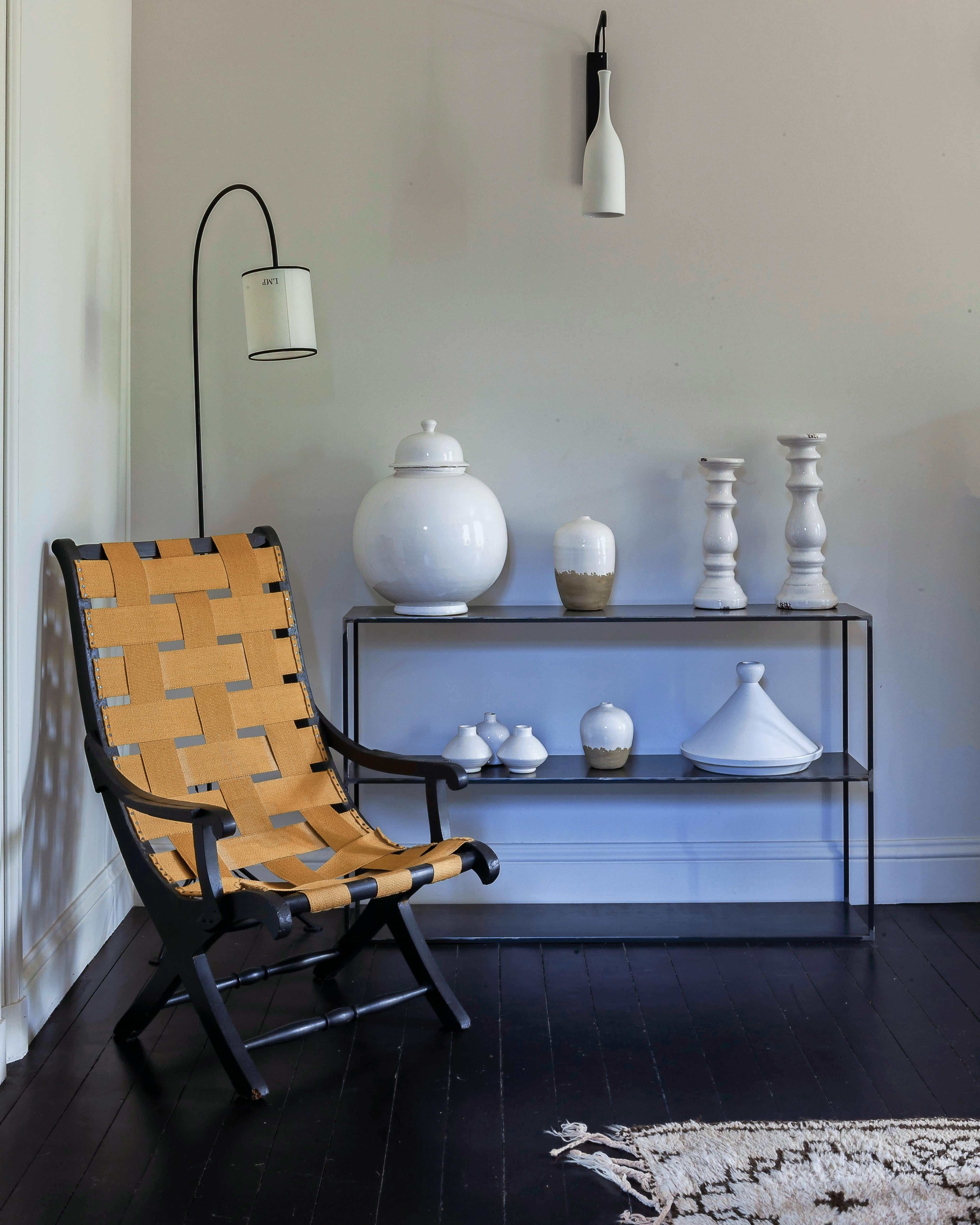 En enkel, lav reol fungerer godt som display for små samlinger af fx keramik. De marokkanske krukker og stager er hjembragt fra en rejse til Marokko, og stålreolen er specialfremstillet af Stéphane Degas' firma, Atelier de Steel.