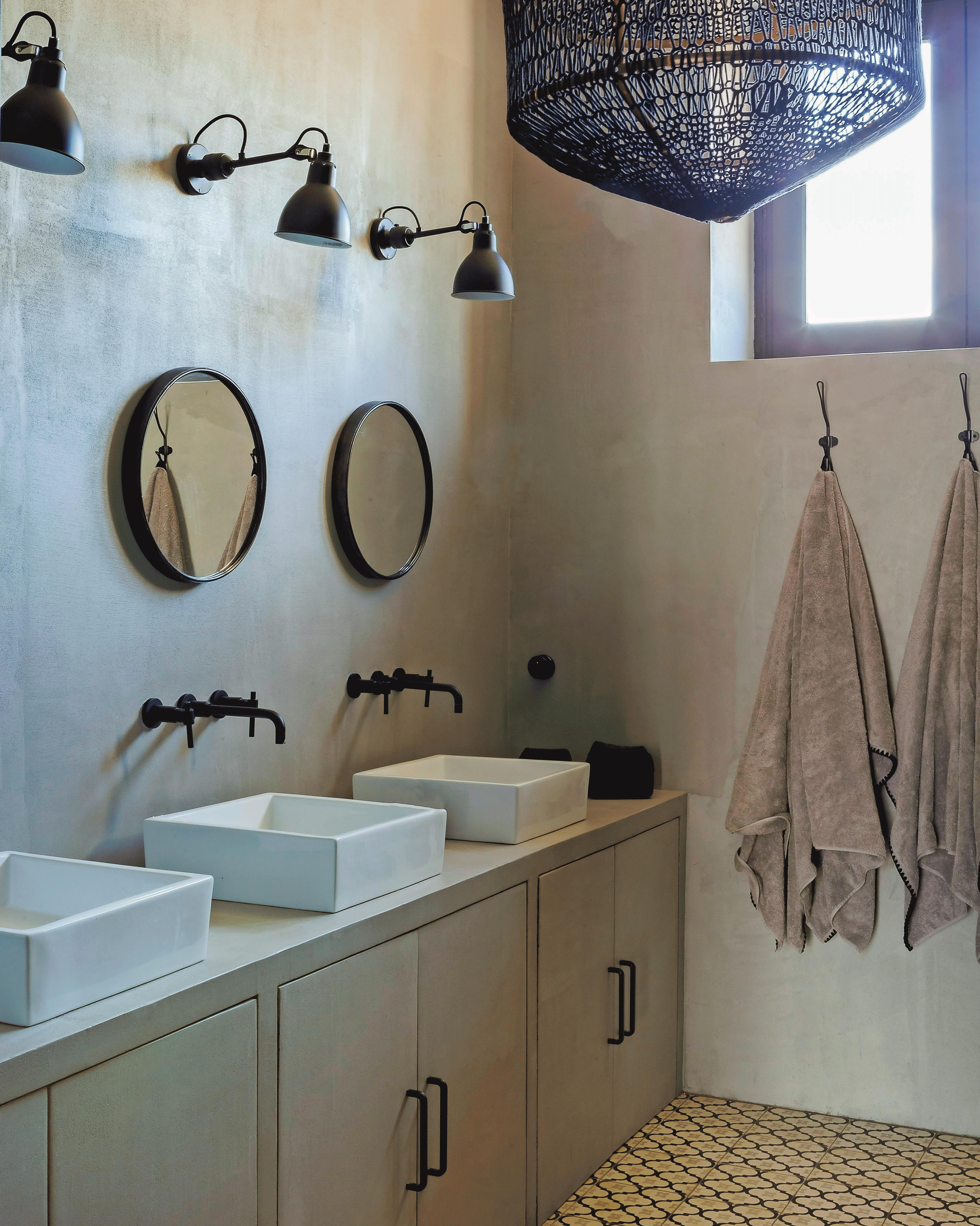 Hvis du ikke har mod på en betonvæg på badeværelset, kan du imitere looket med indfarvet spartelmasse, der giver samme rå effekt. Væglamperne er fra DCW, og håndklæderne fra Harmony Textile. Spejlene er fra Pomax, og loftlampen er fra AY Illuminate.