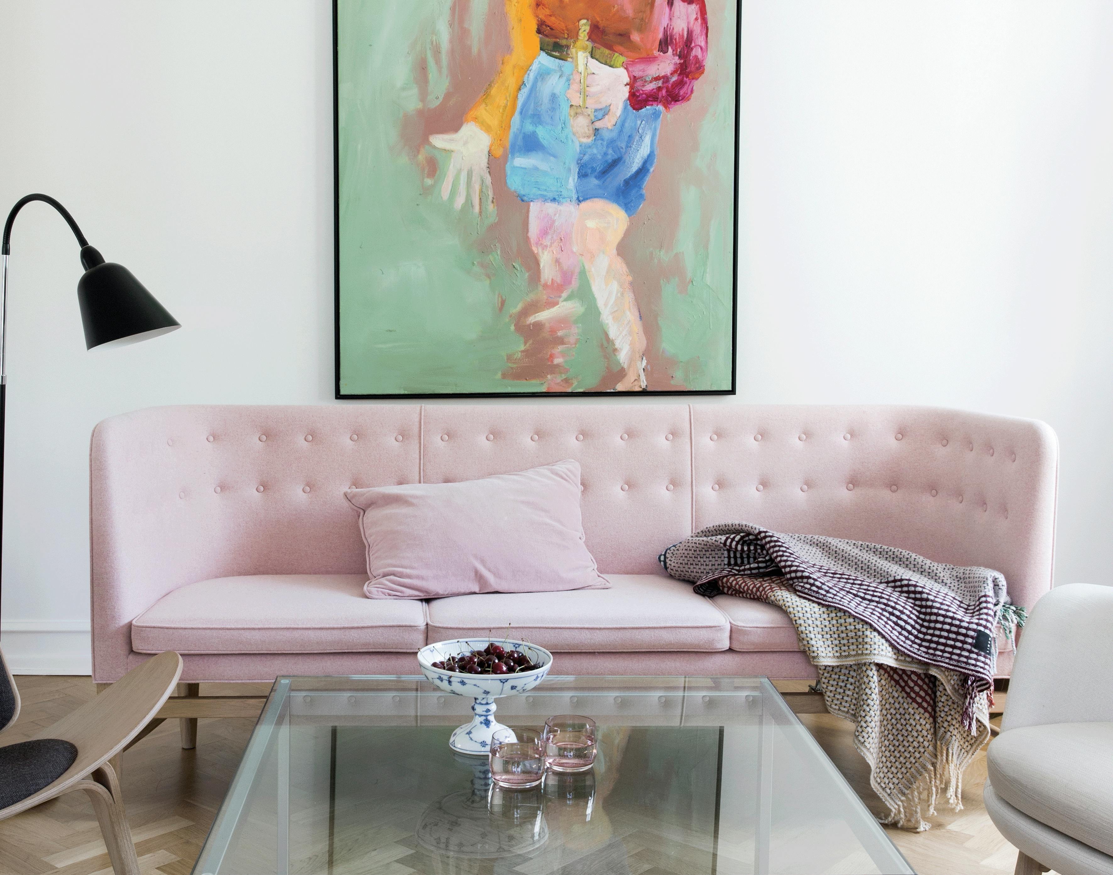 – En del af væggene i stuerne er blevet malet i en støvet gråblå kulør og giver sammen med farverig kunst og den lyserøde Mayor-sofa, som Arne Jacobsen tegnede i 1939, et pastelfarvet udtryk til hjemmet.