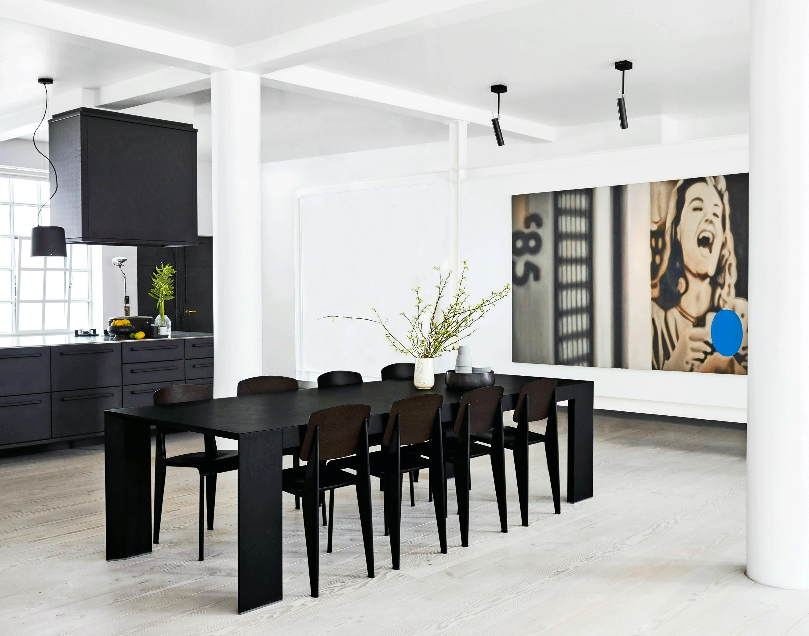 Alle fælles funktioner er samlet i lokalet: Køkken, spisestue, dagligstue, kontorplads og musikafdeling – en ruminddeling, der understreger lejlighedens fortid som fabrik og minder om et loftrum i newyorker-stil.
