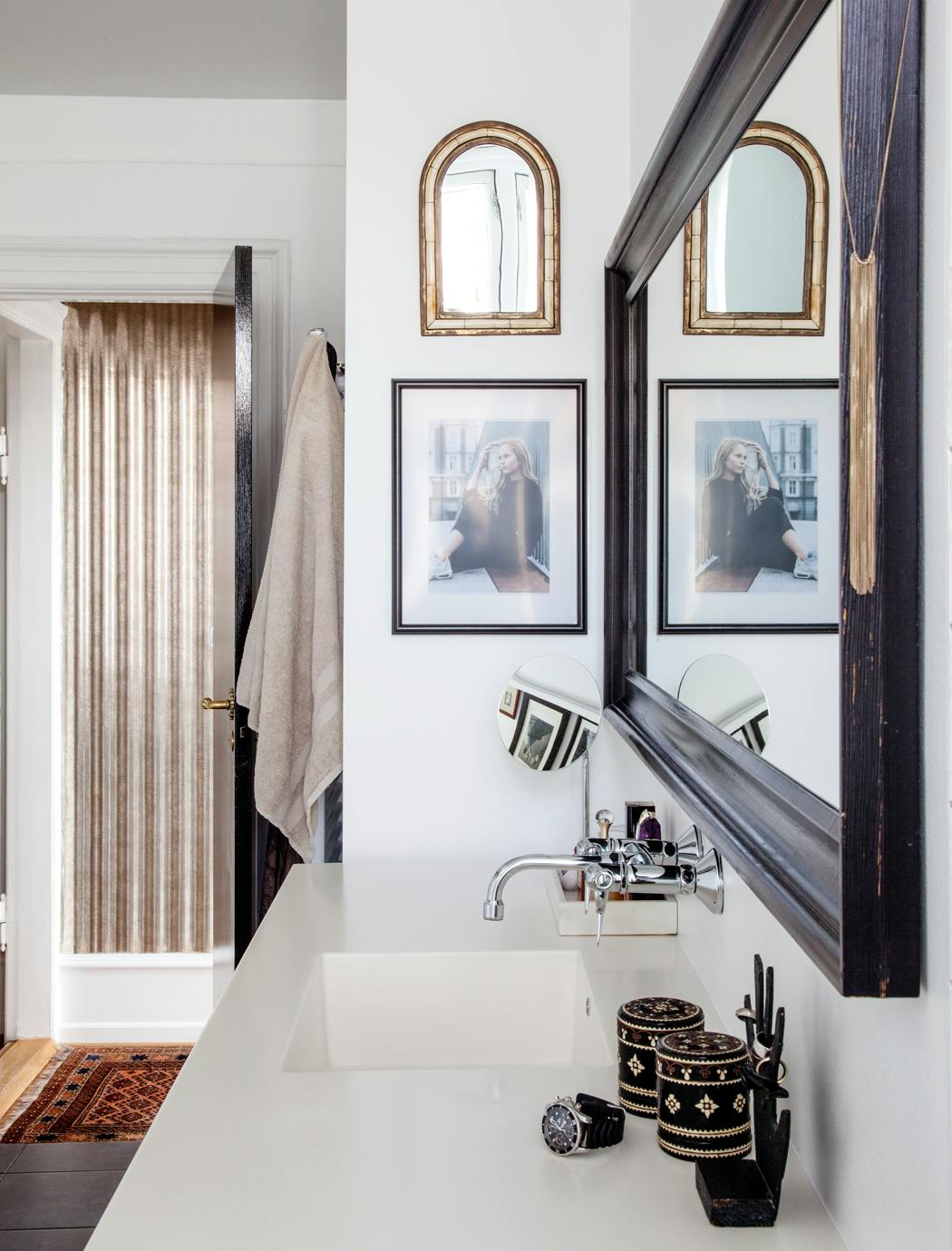 Et sterilt badeværelse kan få karakter og personlighed, hvis du tilføjer unikke detaljer såsom gamle rammer og franske spejle, der bryder med stilen.