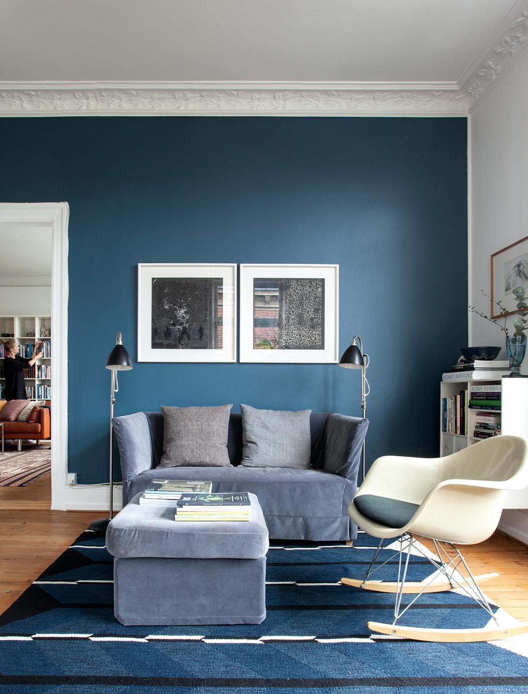 Det kan være effektfuldt at indrette sig tone i tone. Tag udgangspunkt i et møbel, når du vælger farve til vægge og tæpper, og gå efter en nuance, der matcher uden at være identisk. Gyngestolen er designet af Charles & Ray Emas for Vitra og bestlite-lamperne er fra Gubi.