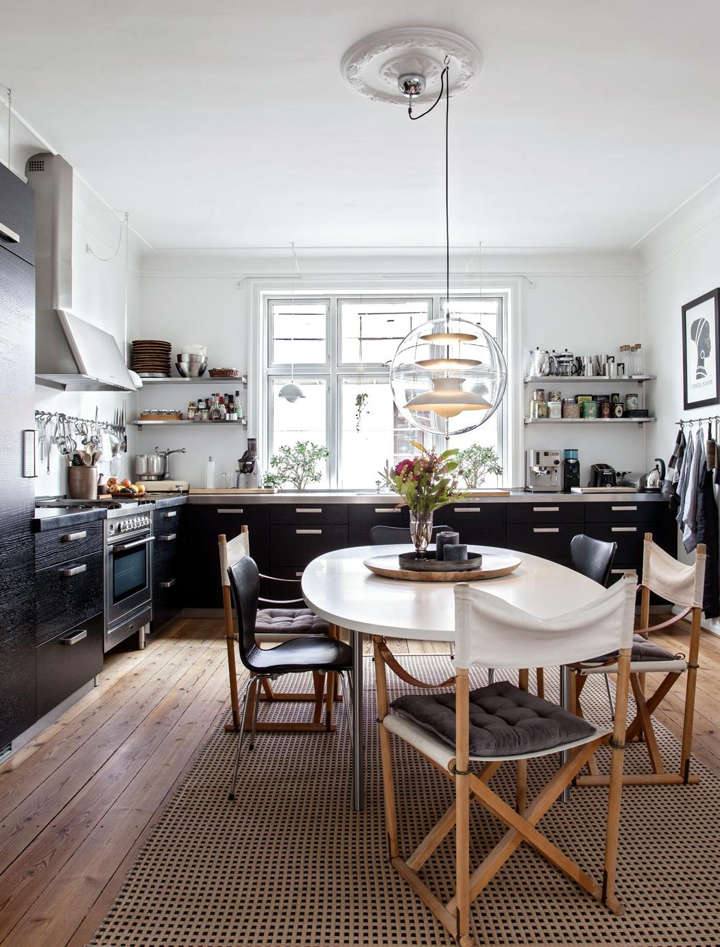 Hvis du gerne vil bløde et industrielt køkken op, kan du droppe overskabene og i stedet have åbne hylder, der viser pæne æsker og service. Stole med betræk i stof giver også hjemlighed. Køkkenet er fra Kvik.