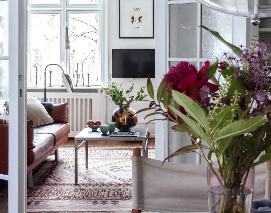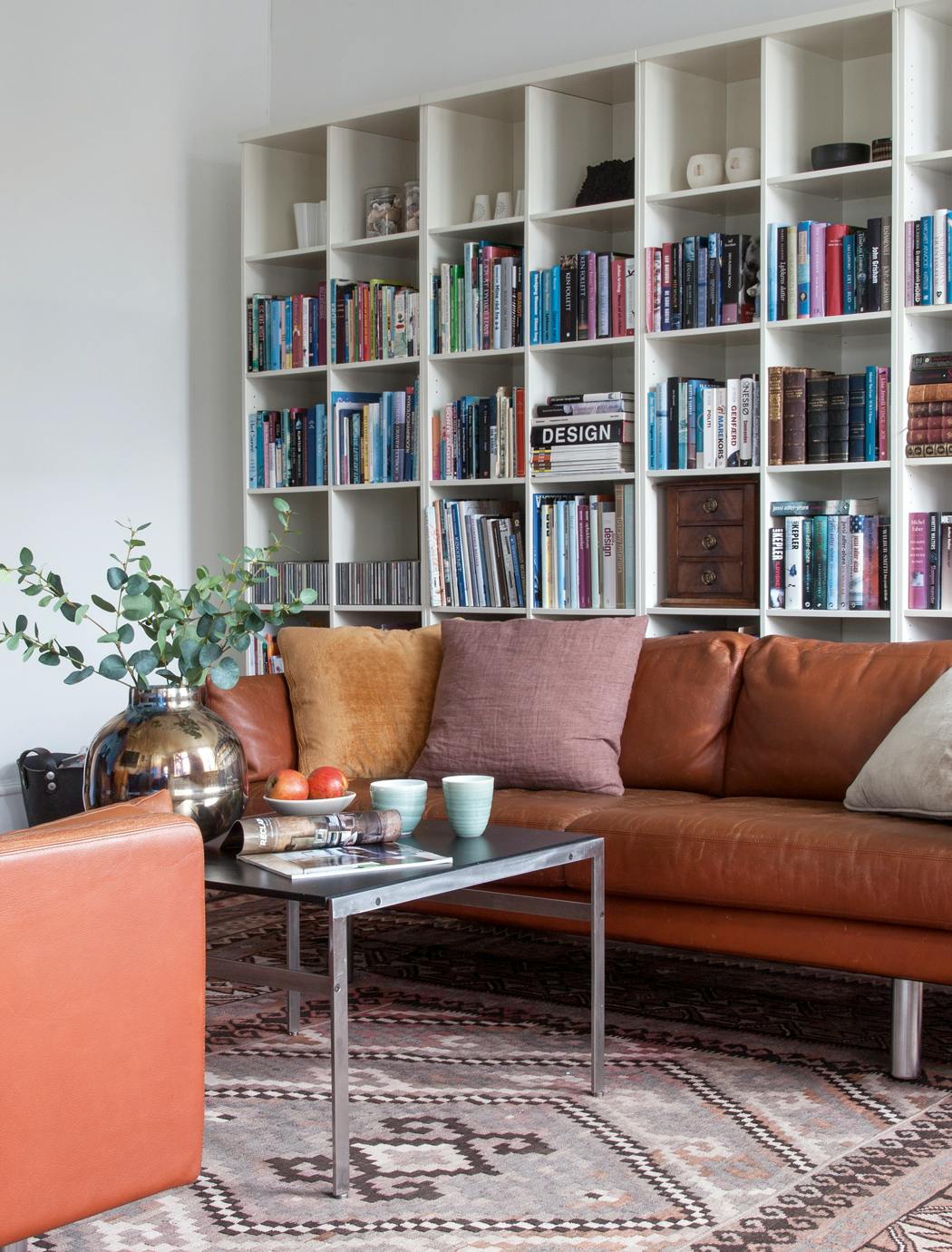 Hun dyrker tanken om bæredygtighed ved at investere i langtidsholdbare møbler såsom hendes to ombetrukne sofaer, som hun havde med sig, da hun for snart 30 år siden flyttede ind i sin første lejlighed. Dem sætter hun sammen med moderne nips, unikakeramik og puder i tidens støvede farver.