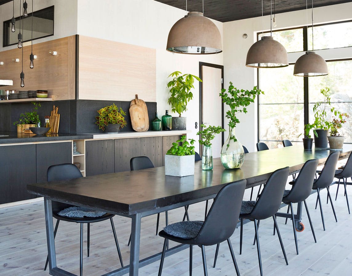 Hjulene under det enorme spisebord med en tung bordplade af beton gør det nemt at flytte rundt på, når der er brug for det. Og loftshøjden i rummet gør, at bordets størrelse ikke føles abnorm. Spisebordet Eber Concrete er Johan Israelsons design, og lamperne er genbrugsfund fra København.