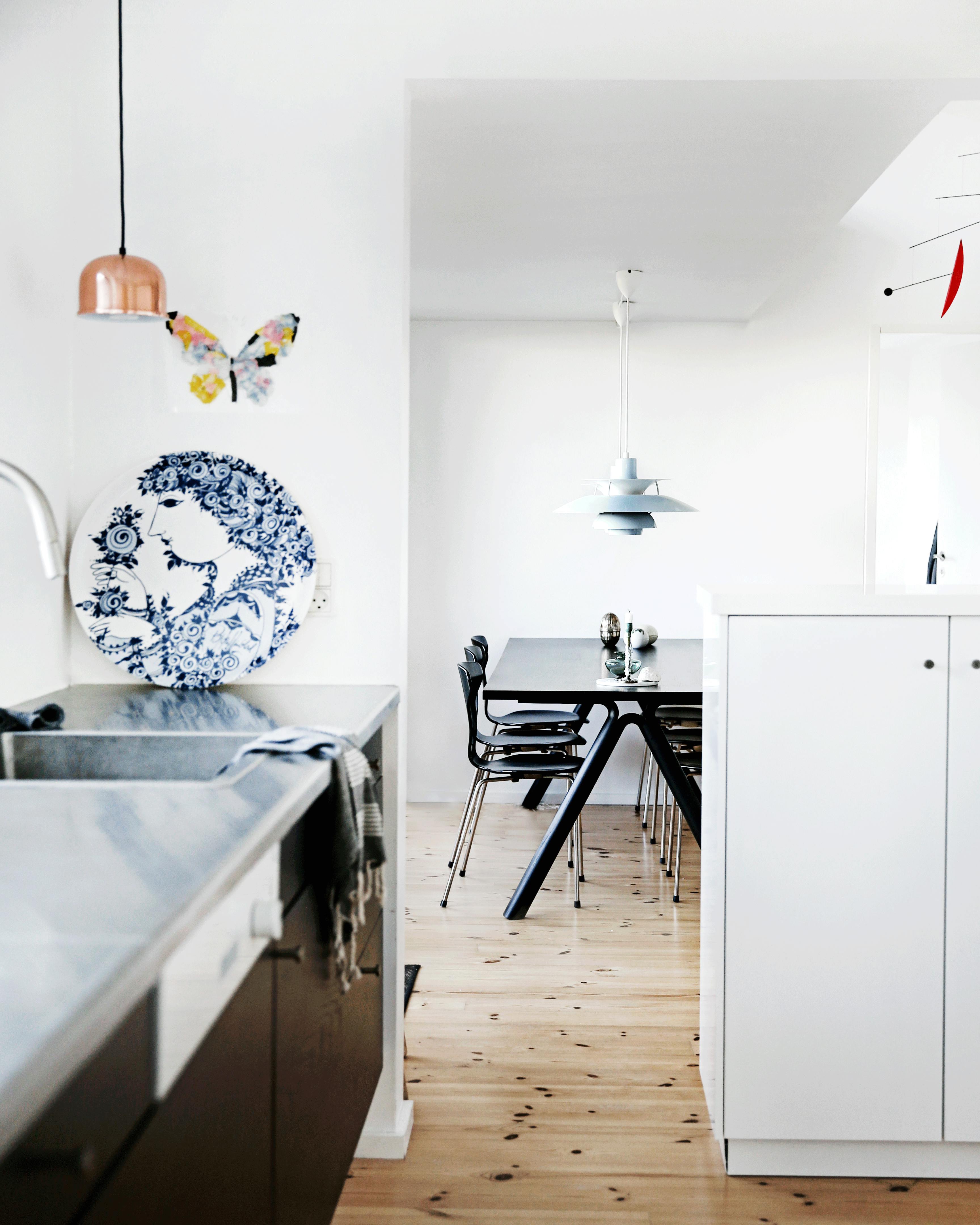 Køkkenet er fra Ikea. Lamperne er fra PH, spisebordet fra HAY og stolene Arne Jacobsens 'Munkgaardstolen'.