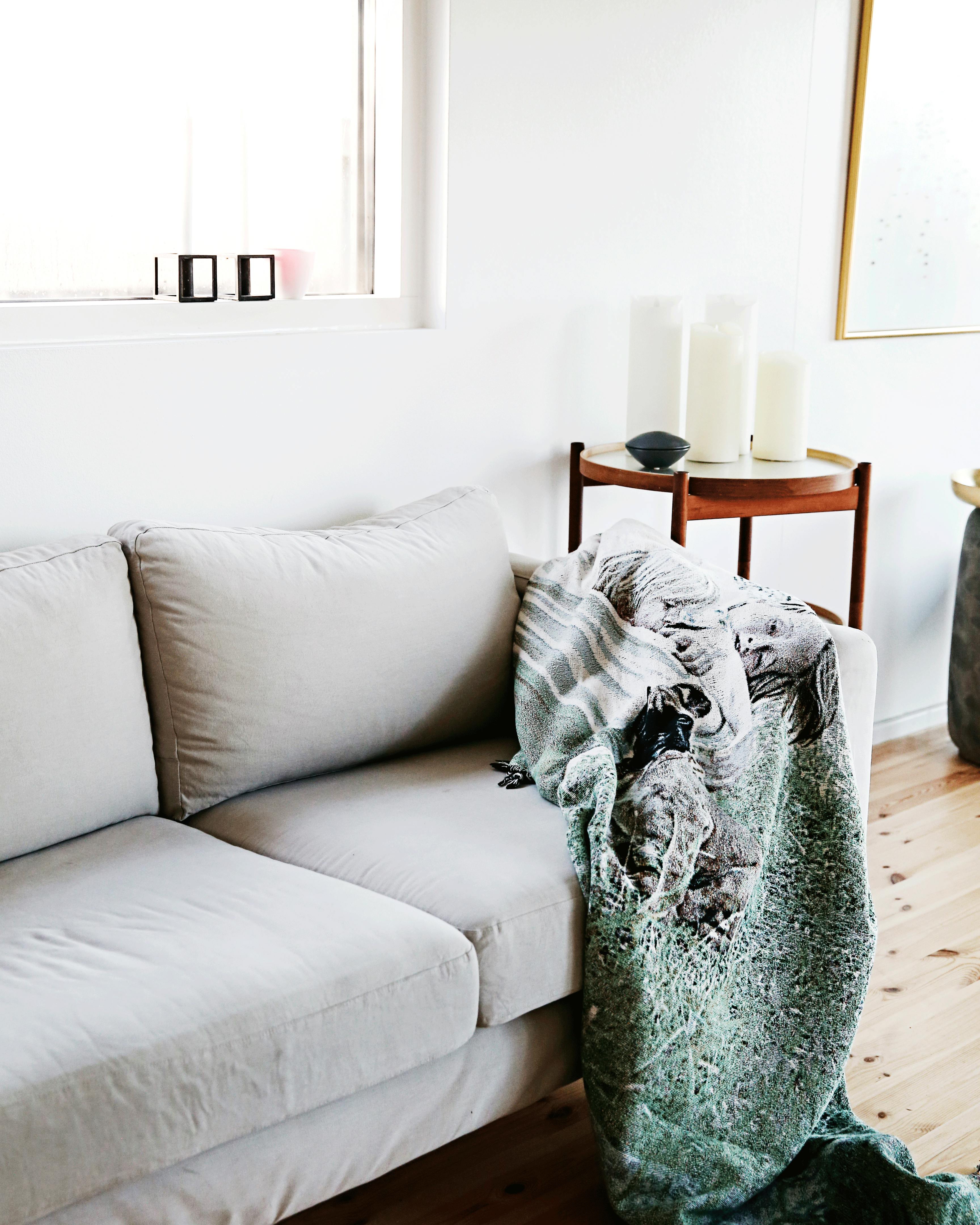 Plaiden med motivet giver et grafisk udtryk i stuen. Sofaen fra IKEA.
