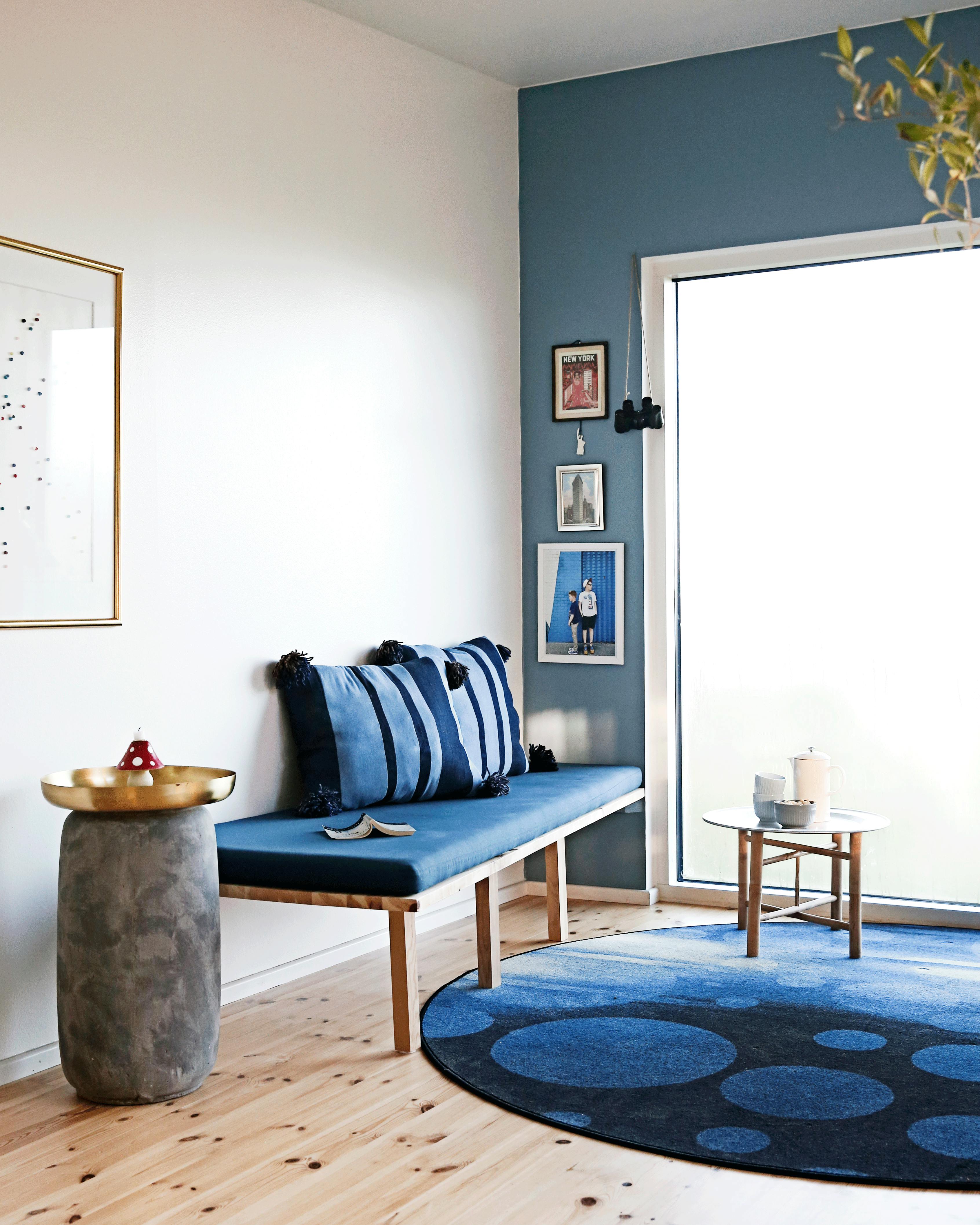Hvis du har en krog, der er svær at indrette, så lav selv møblet, der passer til. Da vinduet skulle være så stort som muligt, er der kun 40 cm væg – alt for smalt til en sofa. Sif Meincke satte en liste på væggen, fik byggemarkedet til at skære en trapez-formet træplade, satte den på listen og skruede ben på. Hynden er speciel lavet hos Hyndesnedkeren.