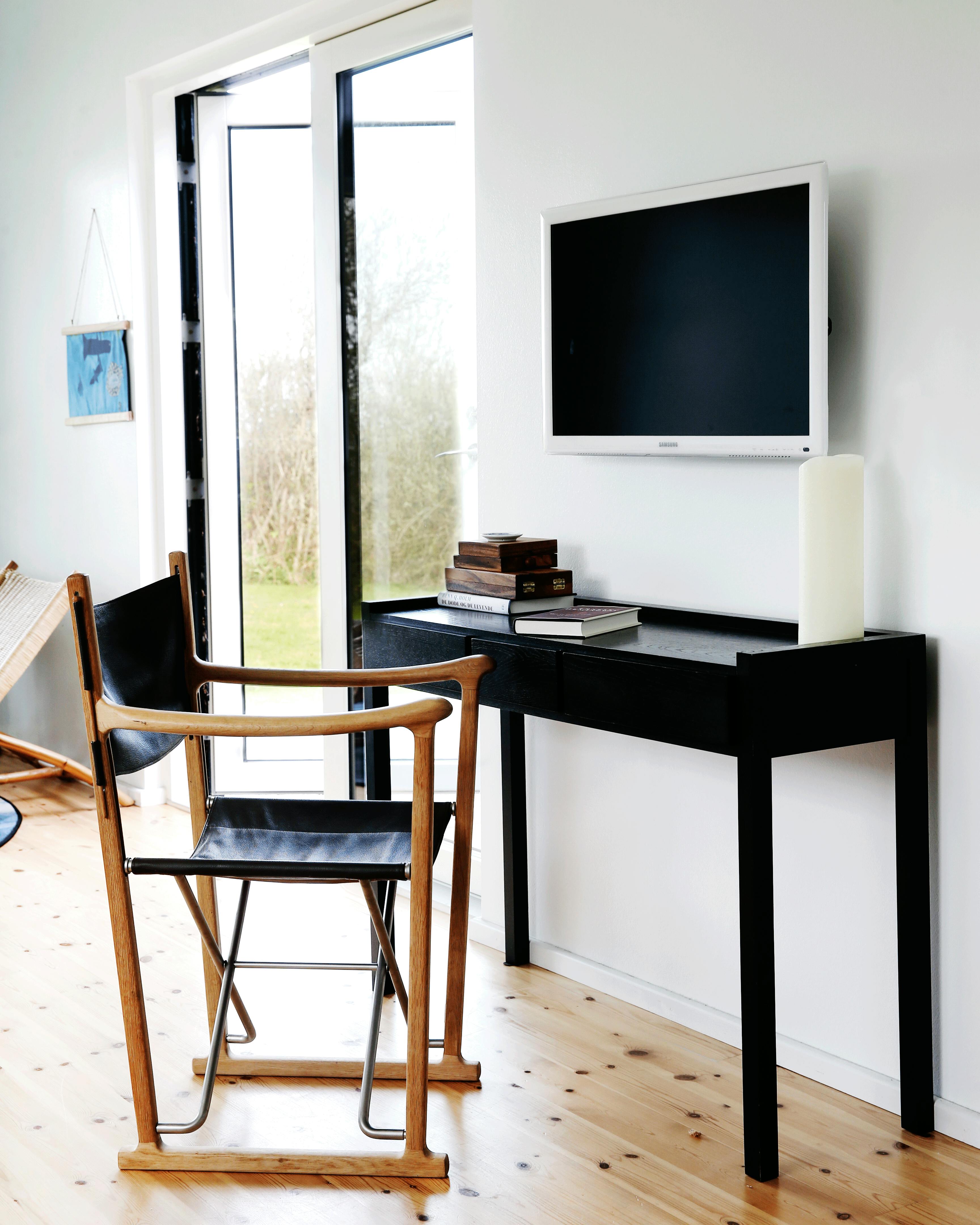 Skab små ”øer” i dit hjem med samme farvetone. Skrivebordskrogen er holdt i sort. Bord fra R.O.O.M der lå i det tidligere Daells Varehus, er desværre lukket ned og stolen med lædersæde og –ryg er fra Trip Trap.