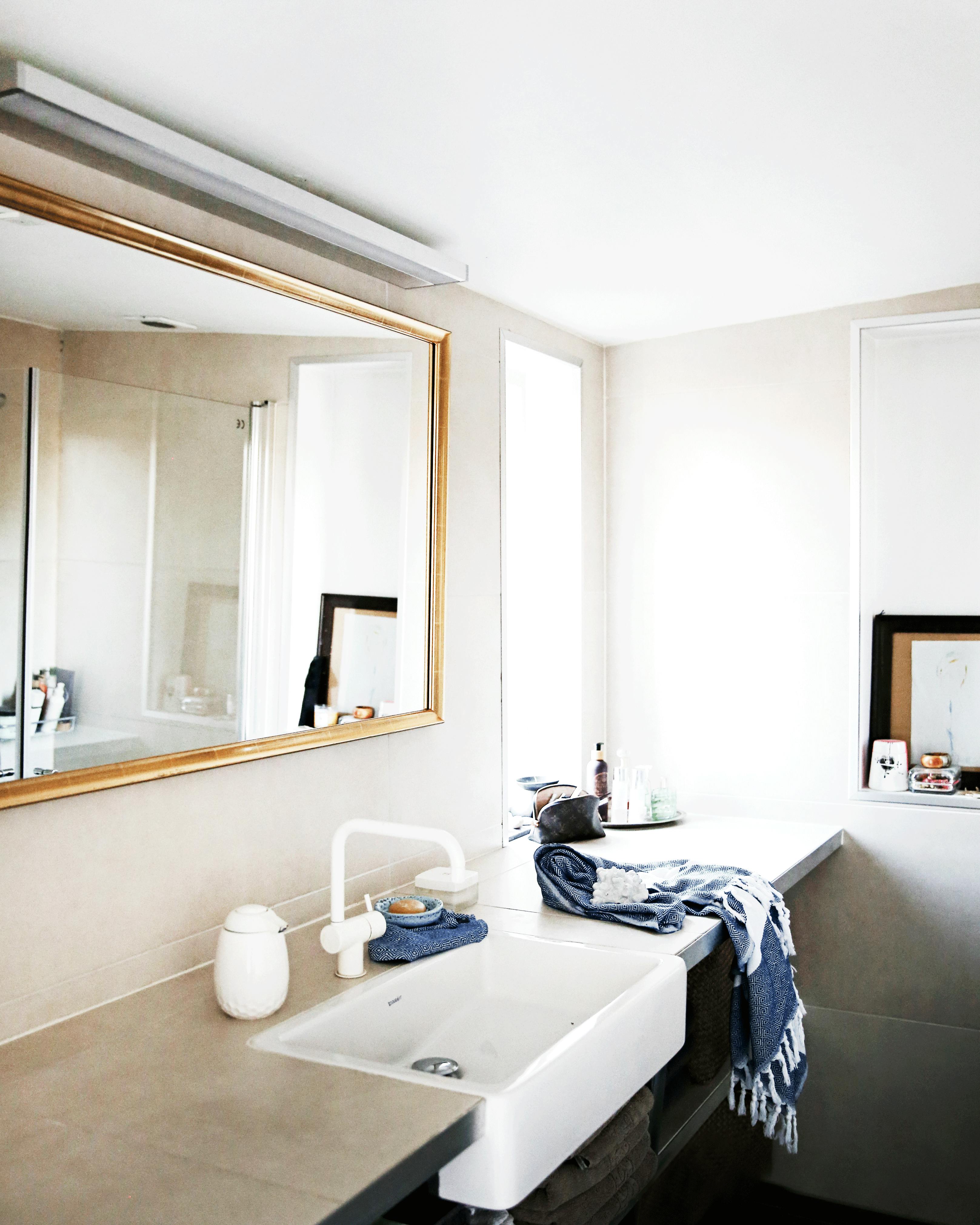 Hjemmelavet sæbeskål. Det var egentlig en fejl. Glasuren ville ikke hæfte på stentøj, så der kom de fine bobler. Sæben er en gave fra guldsmeden Rebekka Notkin. Og håndklædet i havets farver er fra VIIL.