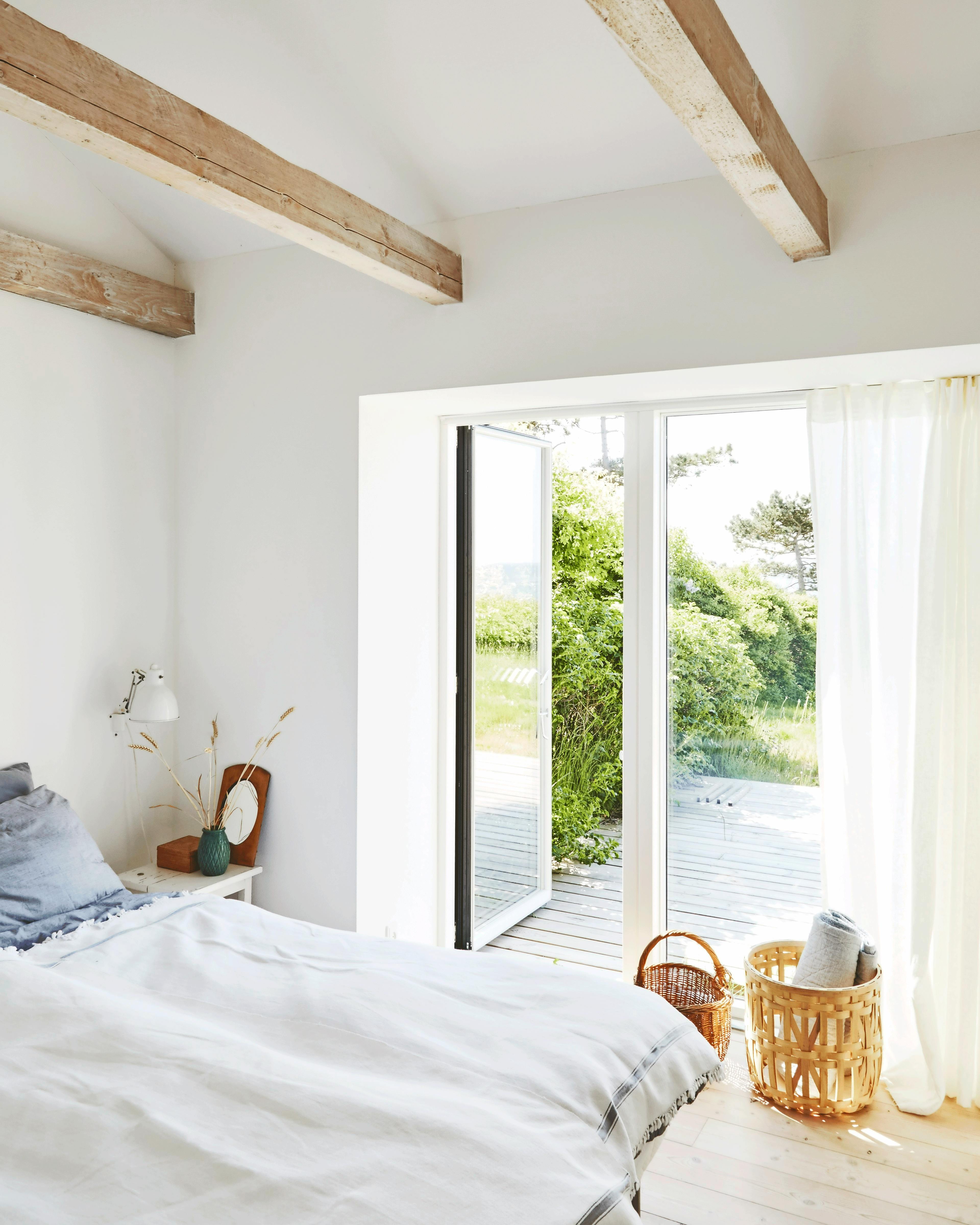 Husets fritliggende bjælker er med til at øge fornemmelsen af luft og rum, og ligesom husets hjemmetegnede køkken i krydsfiner er de blevet behandlet med hvidolie. Det lyse og luftige udtryk understøttes af husets møbler og øvrige interiør, der er stringent, uden det får sommerhuset til at virke tomt og kedeligt.