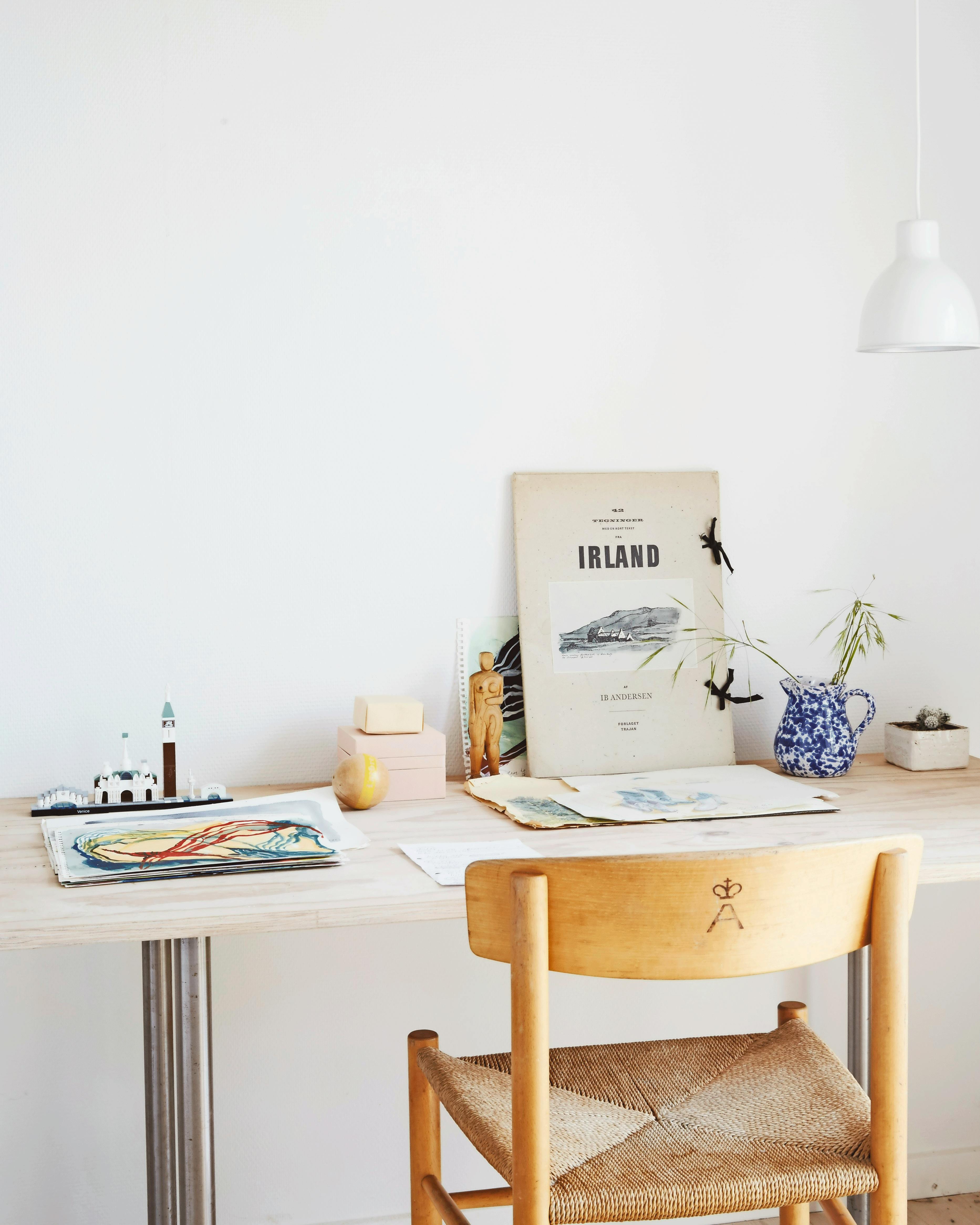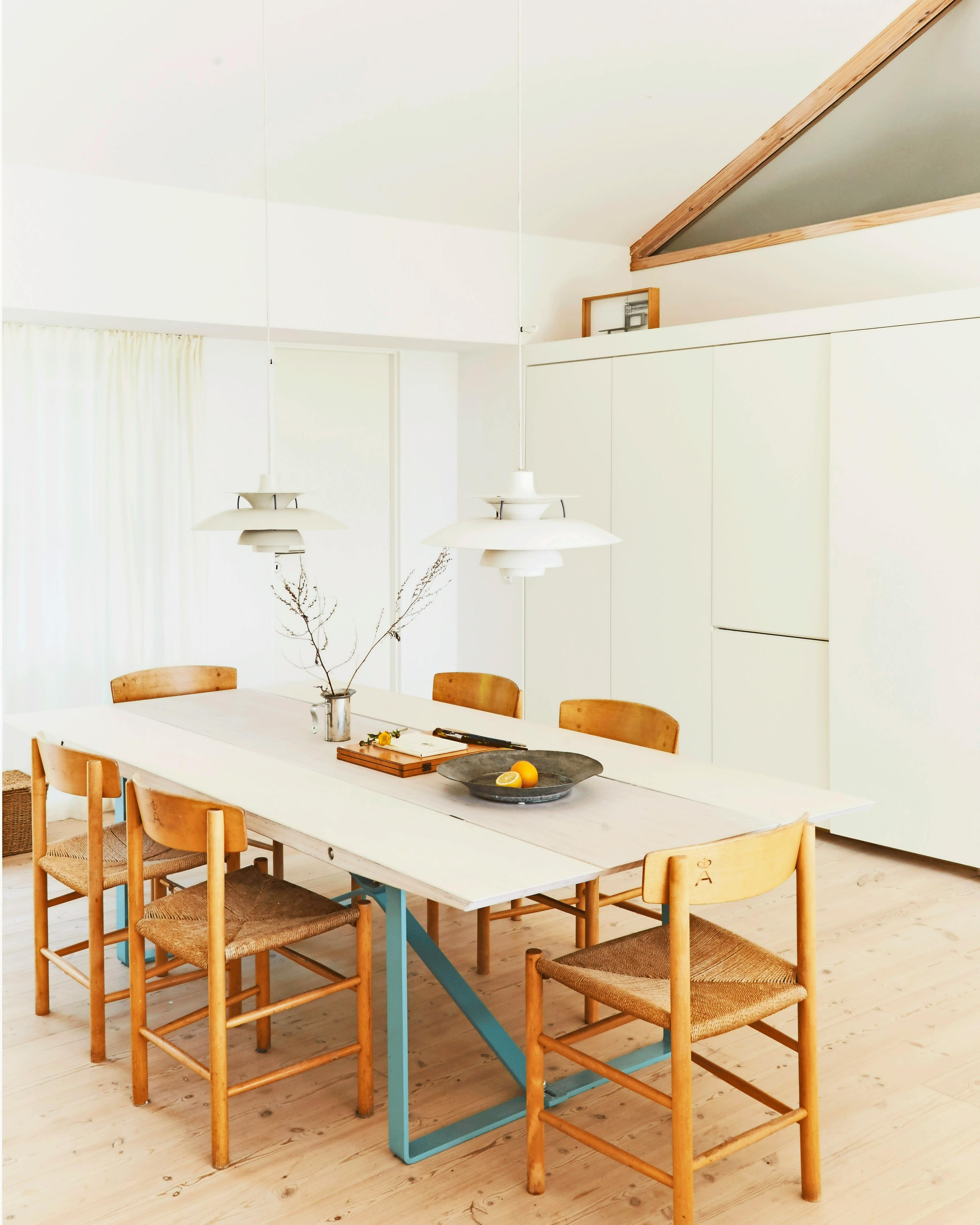 Hæng to lamper over spisebordet, hvis du vil understøtte fornemmelsen af langbord. Bordet i krydsfiner med sprøjtemalede stålben har Claus Bjarrum selv designet. Spisebordsstolene er Børge Mogensens J39 – eller Folkestolen – fra Mogensens tid som leder af FDB's møbeltegnestue.