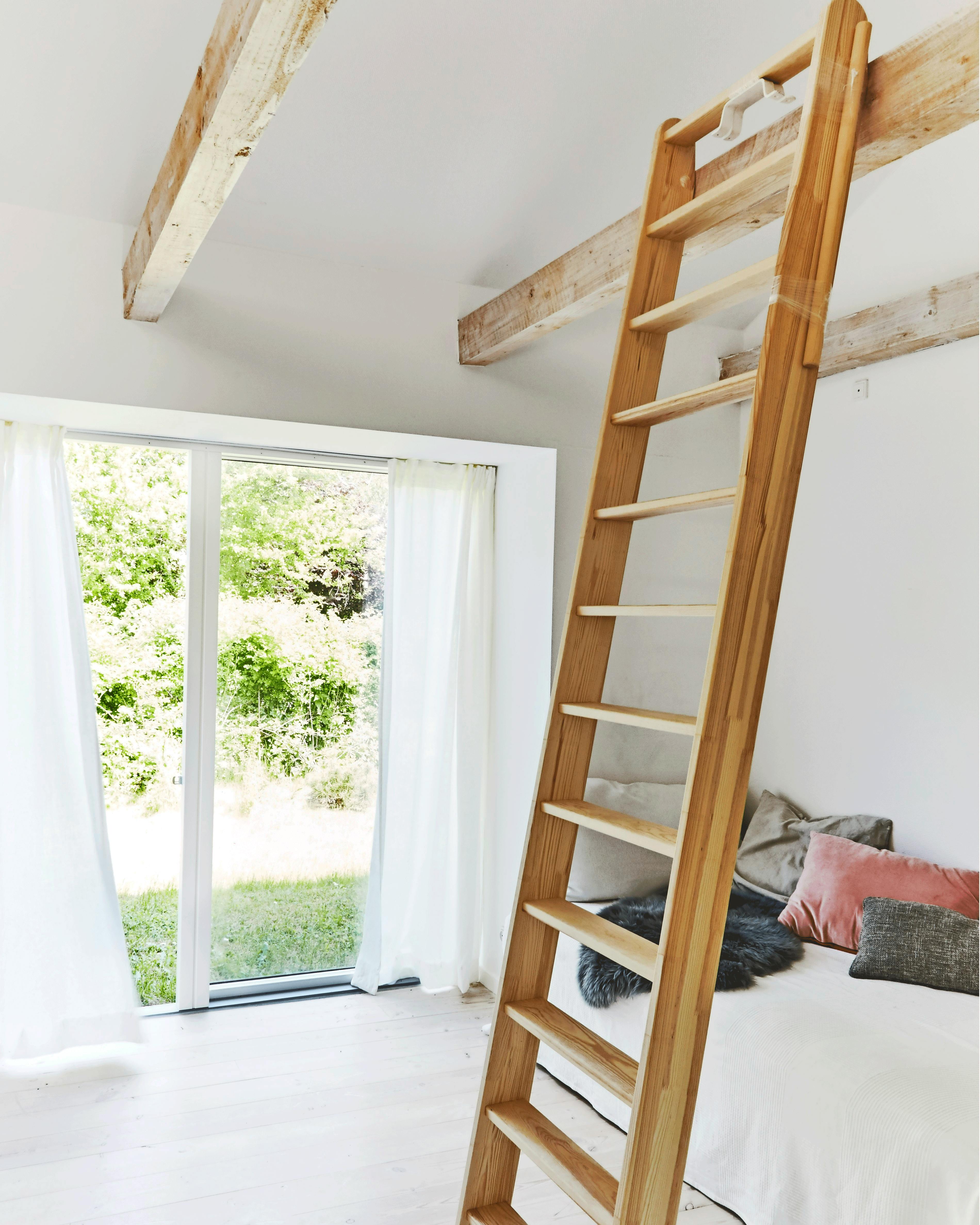 Med en rude øverst i væggen mellem de forholdsvis små soveværelser rejser lyset på tværs af rummene og får dem til at virke større.