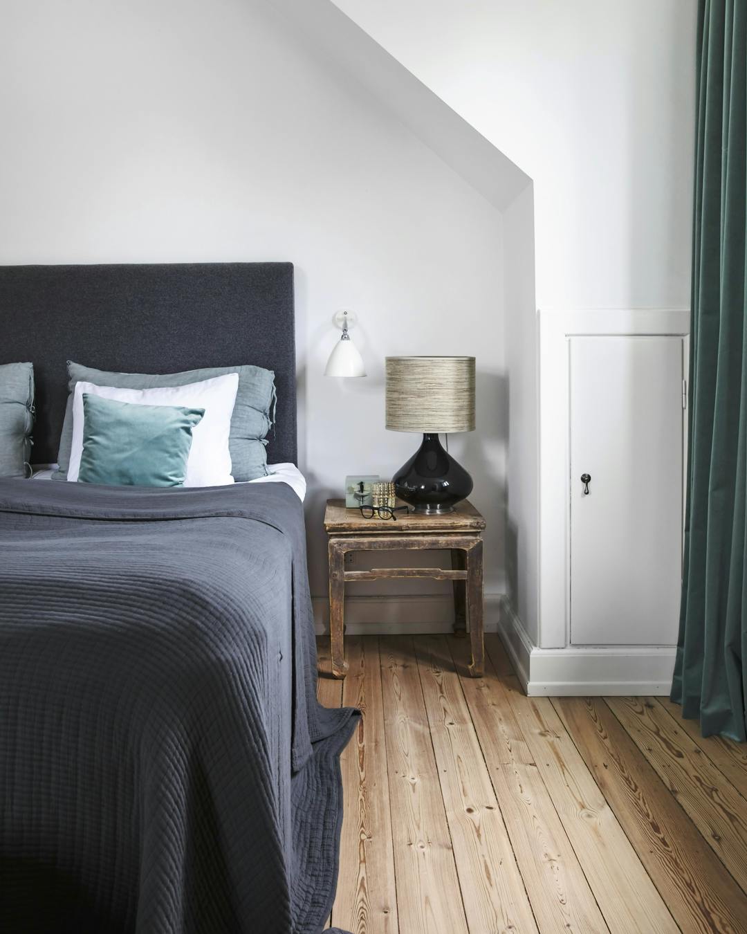 Hold væggene hvide, hvis skråvæggene ikke skal overtage rummet, og lad i stedet resten af interiøret være i rolige mørke nuancer. Sengetæppet er fra Tine K Home, og puffen er fra Day Home. Bordlampen er fra Rue Verte, og gardinerne fra Gittes Gardin.