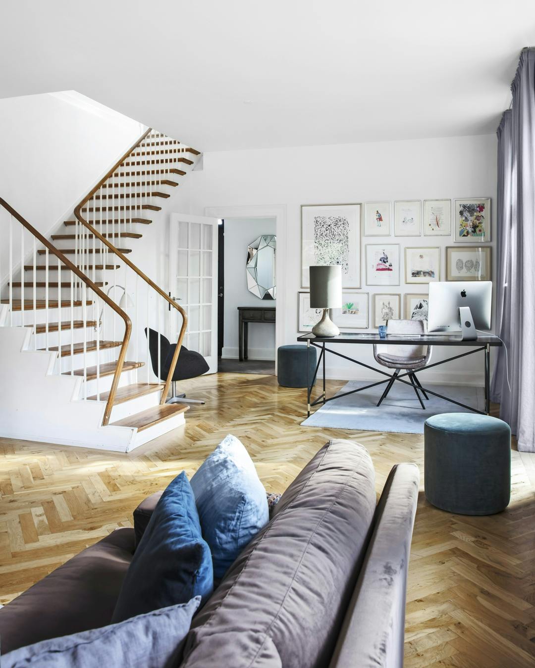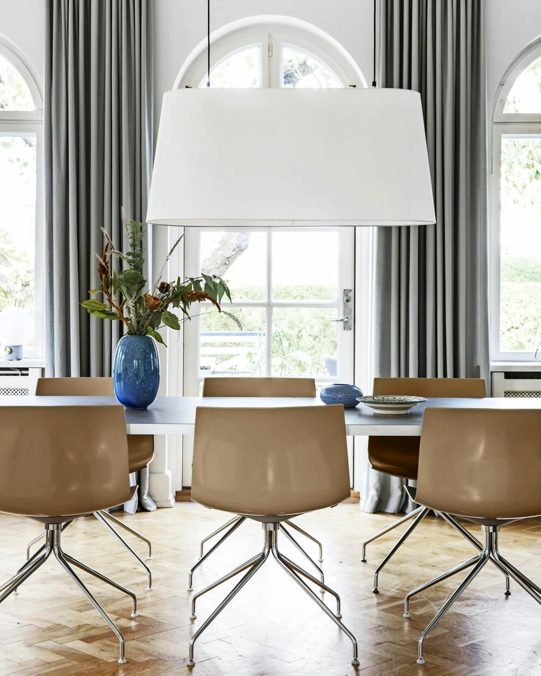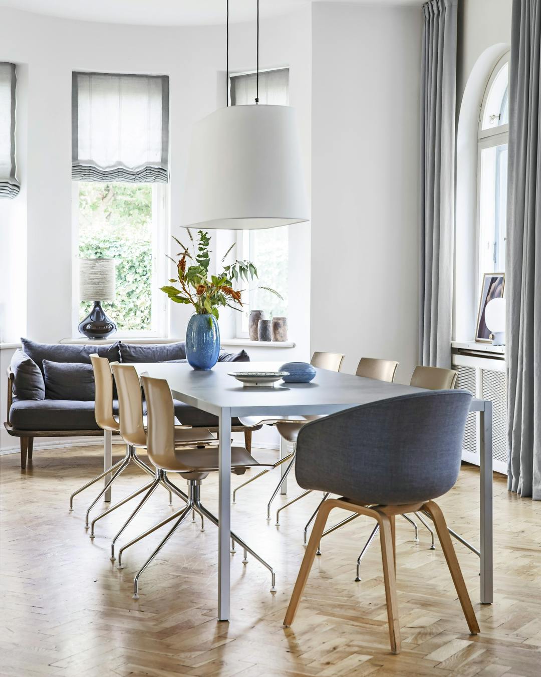 De knap 200 m² ligger placeret i hjertet af det gamle Vedbæk nord for København og er fyldt med velbevarede detaljer som sildebensparket, karnap og en snedkereret trappe, der løber som en livsnerve gennem husets etager.