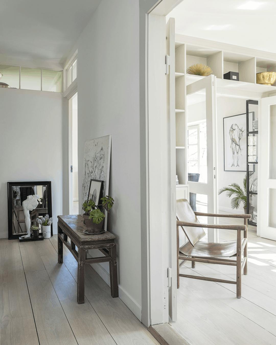 Er pladsen trang i gangen, så undlad at hænge dybe hylder op, der fylder, men brug i stedet for gulvet eller en smal bænk. På den måde får du flere niveauer ind i gangen. Bænken er fra Klüver Delhi. Det sølvfarvede billede har Pia Krejler selv lavet, mens det andet billede er fra De Fire Årstider Home.