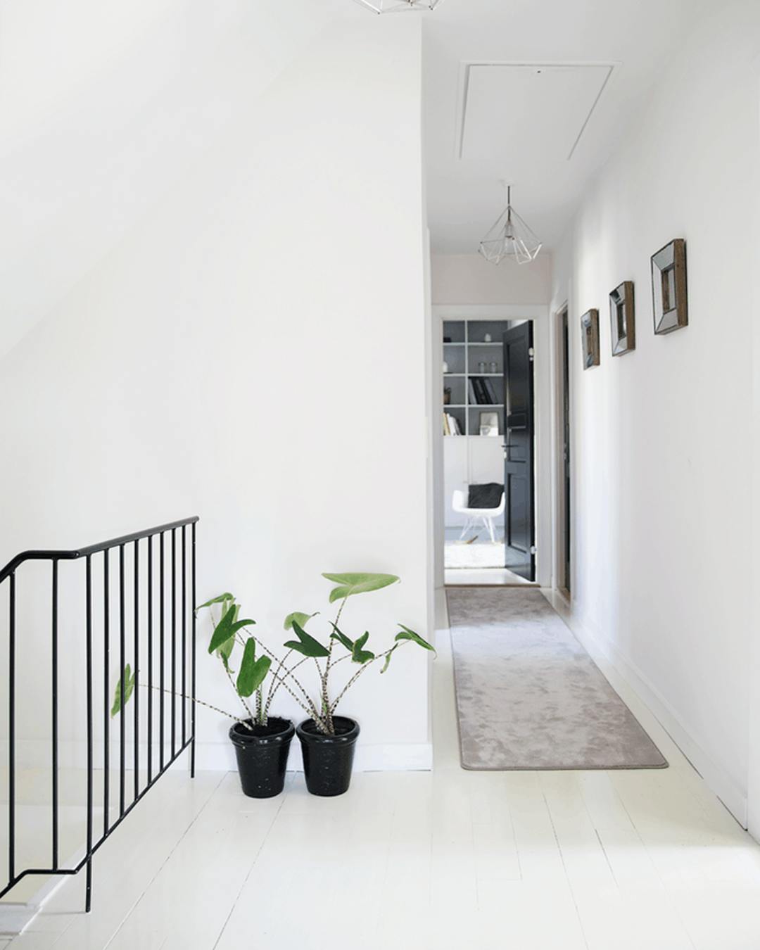 En lang gang kan være svær at indrette. Brug derfor billeder og bløde tekstiler til at pifte den op. Løberen er lavet af en rest fra gulvtæppet i soveværelset. Pendlerne er købt af en kunsthåndværker i Tyrkiet.