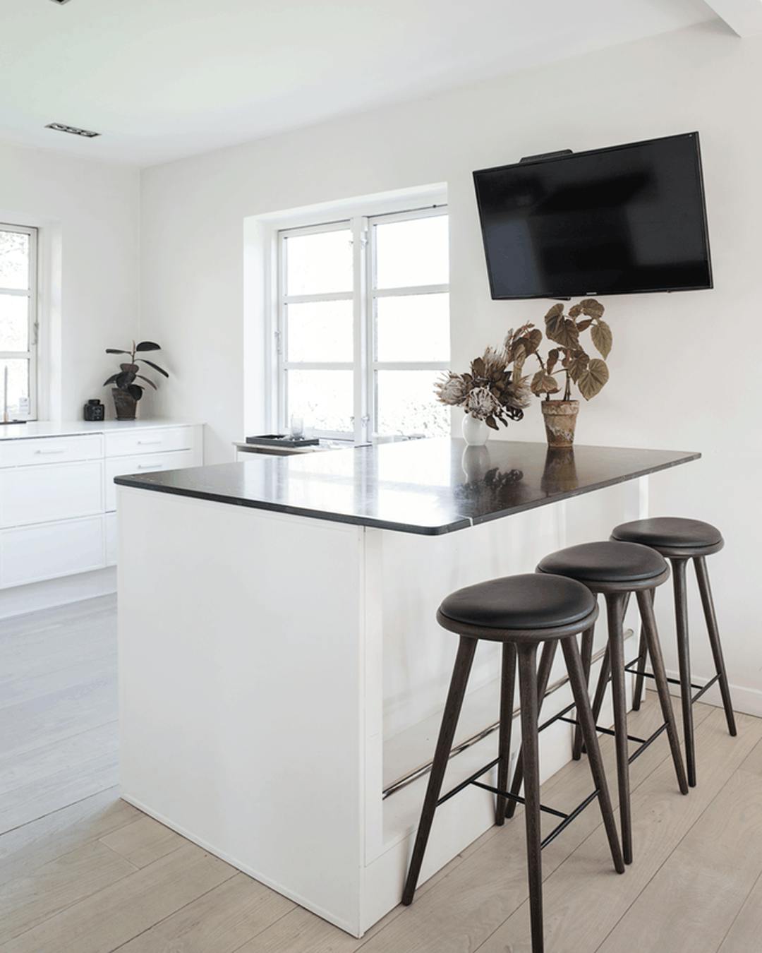 Gå efter smalle barstole, så du har plads til flere på stribe. Køkkenøen er flytbar og indrettet med en stang til at hvile fødderne på. Køkkenøen er fra Funktion, og barstolene er fra Mater.