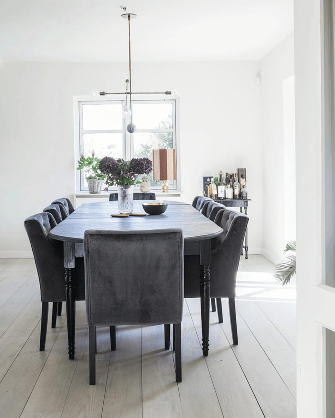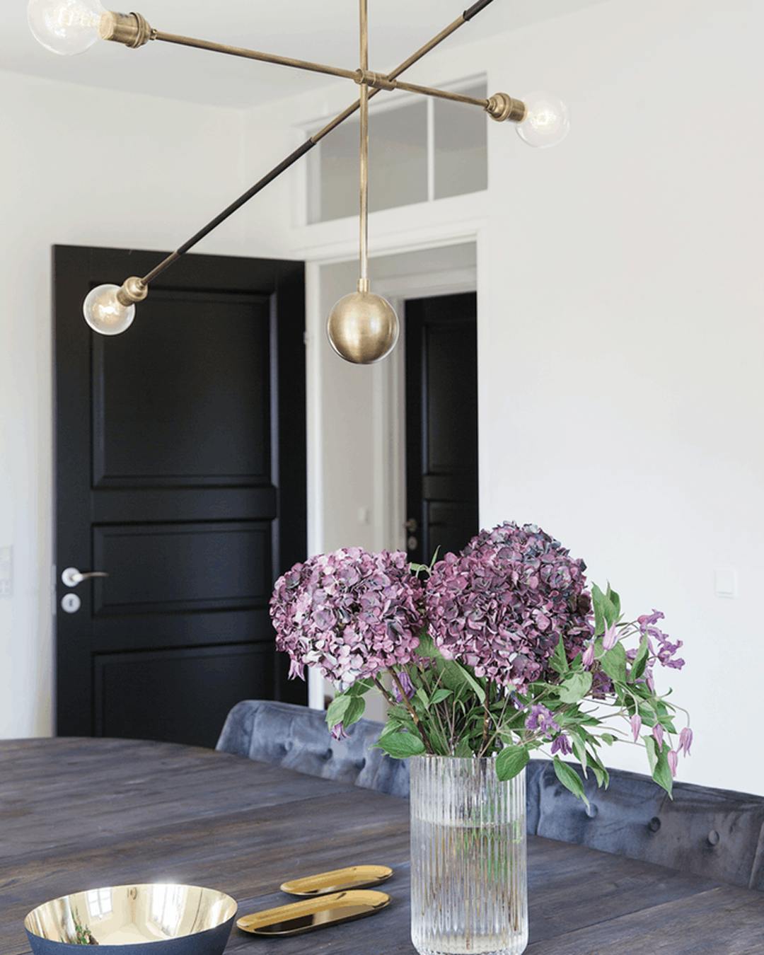 En molekyle-lampe fungerer godt over spisebordet, da lampens form får lyset til at brede sig, så ingen får lyset direkte i øjnene. Vasen er fra Lyngby Porcelæn. De små messingfade er fra Hay, og skålen er fra Bahne.