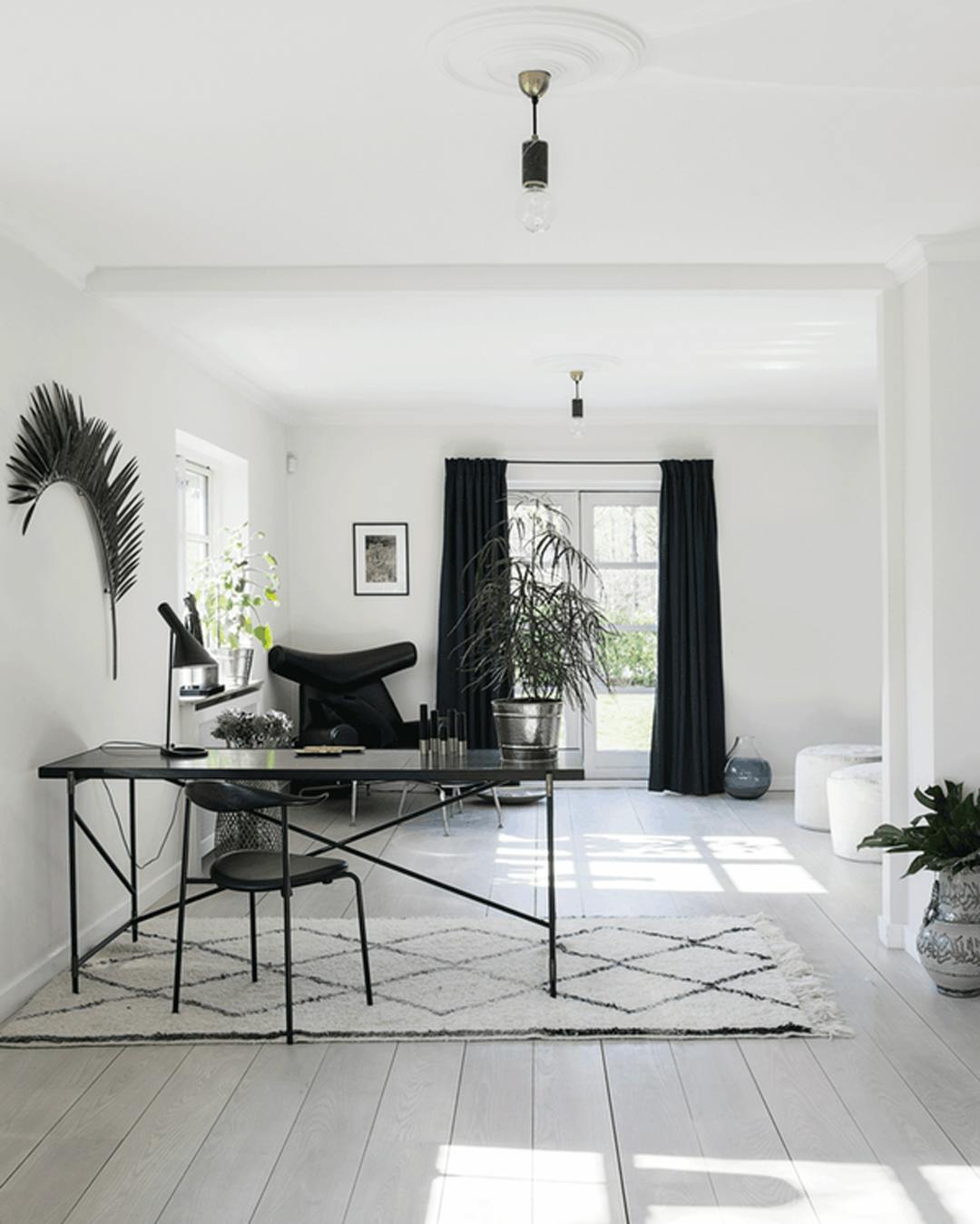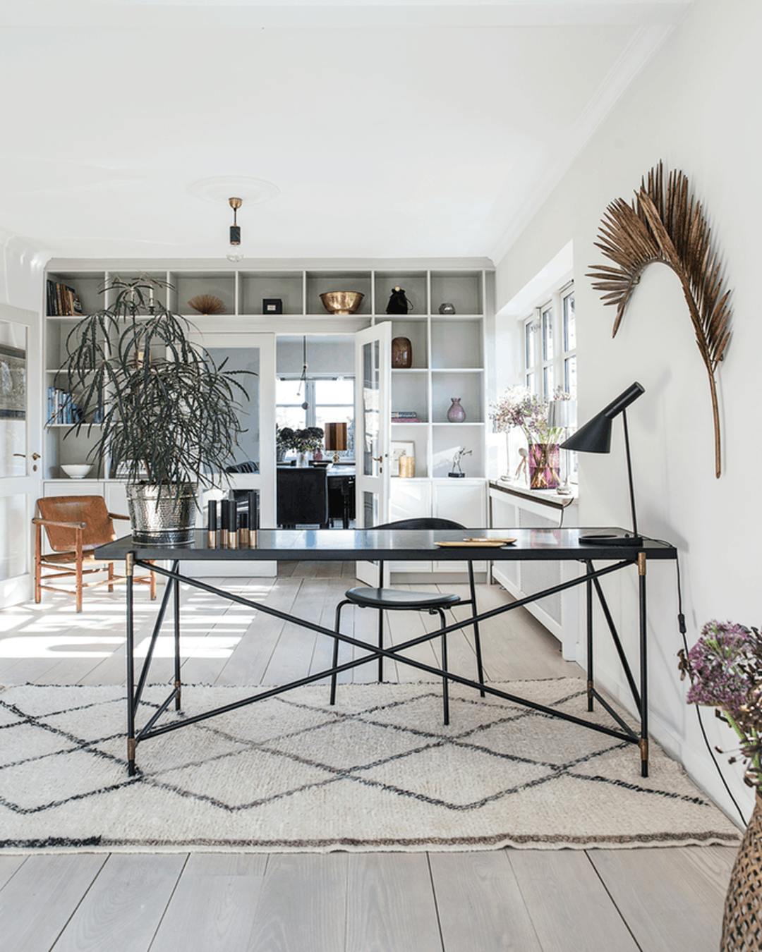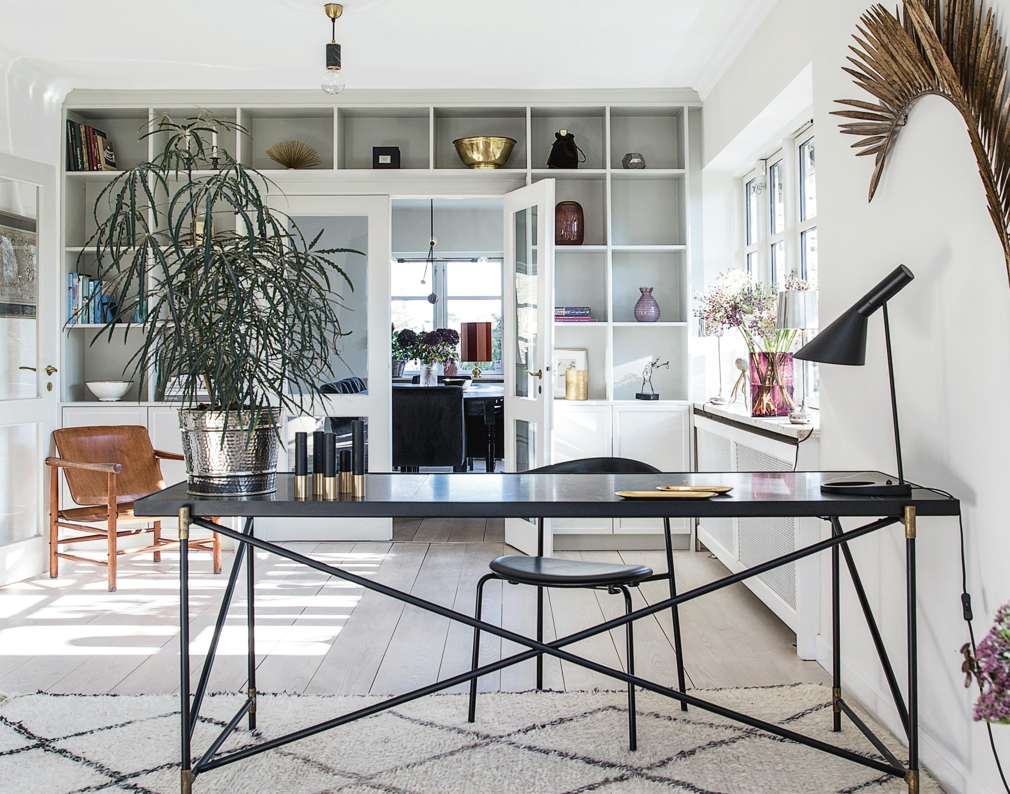 Bruger du et område af din stue som arbejdsplads, kan du indkredse det ved at lægge et tæppe under bordet, så det fremstår mere isoleret fra resten af rummet. Skrivebordet er fra Handvärk. Stolen er fra Wegner. Bordlampen er fra Louis Poulsen, og gulvtæppet er fra De Fire Årstider Home.