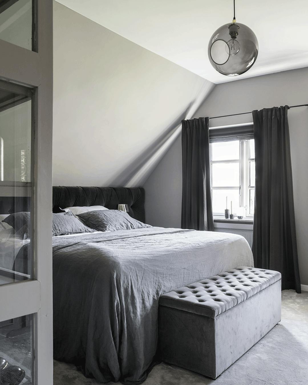Indret dig med et blødt gulvtæppe i soveværelset og undgå de fodkolde morgener. Sengetæppet er fra De Fire Årstider Home. Puffen er fra Hill Street, og pendlen er fra Design By Us.
