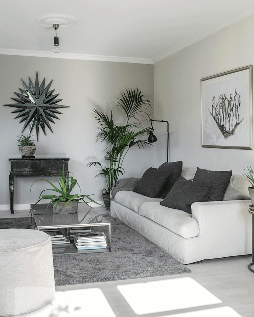 Familien har droppet fjernsynet i dagligstuen. I stedet bruger de stuen til 'samtalerum', og derfor er sofaerne placeret over for hinanden. Konsolbordet er fra Klüver Delhi. Sofaerne er fra Minotti. Bordlampen er fra Jiéldé. Spejlet er fra Reflections Copenhagen. Litografiet er lavet af en ukendt fransk kunstner, og puder, sofabord, sidebord og gulvtæppe er fra Christine Callsen.