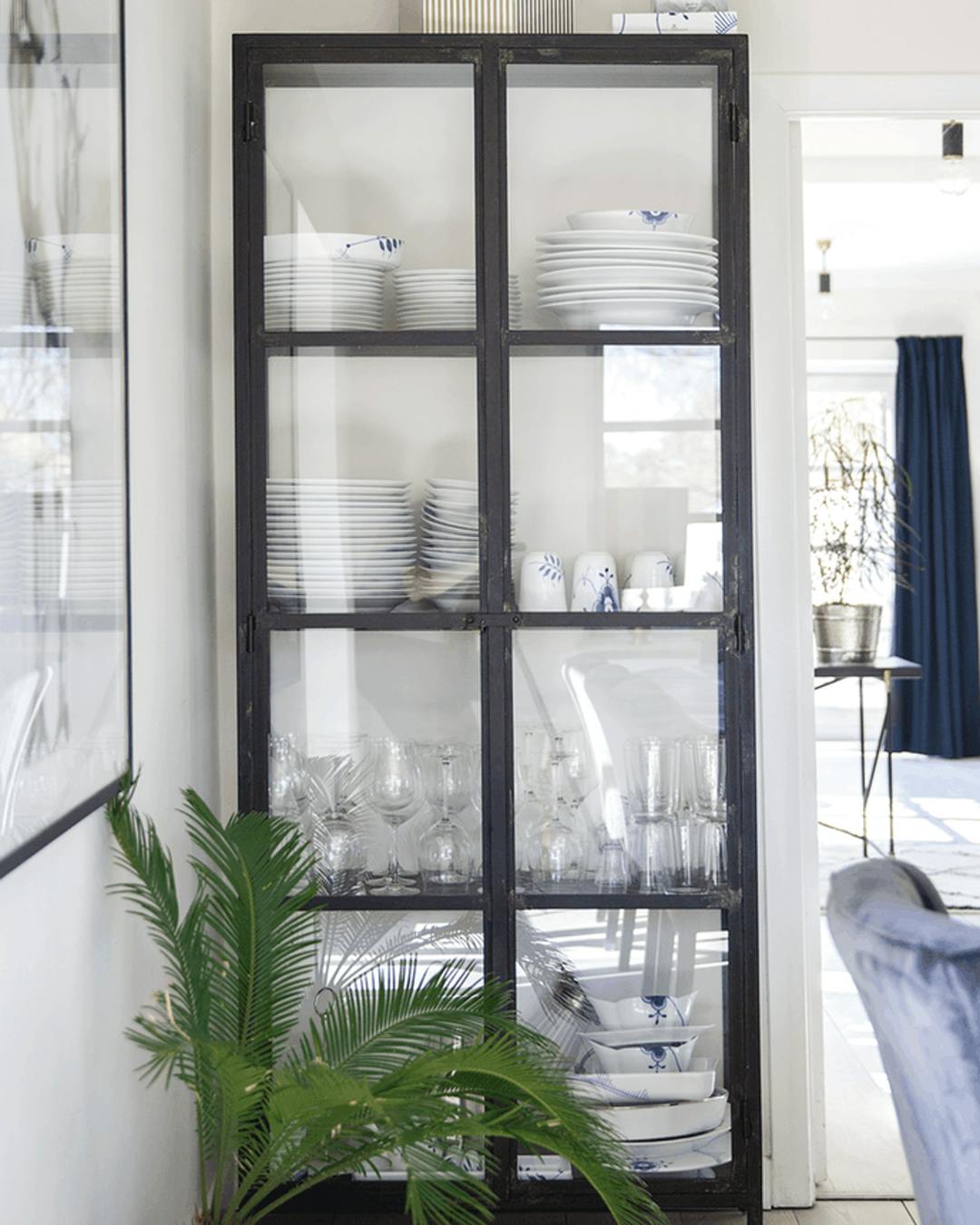 Brug et vitrineskab til at udstille porcelæn og glas. For at gøre borddækningen lettere kan det desuden være en god idé at placere vitrineskabet tæt på spiseområdet. Vitrineskabet er speciallavet.