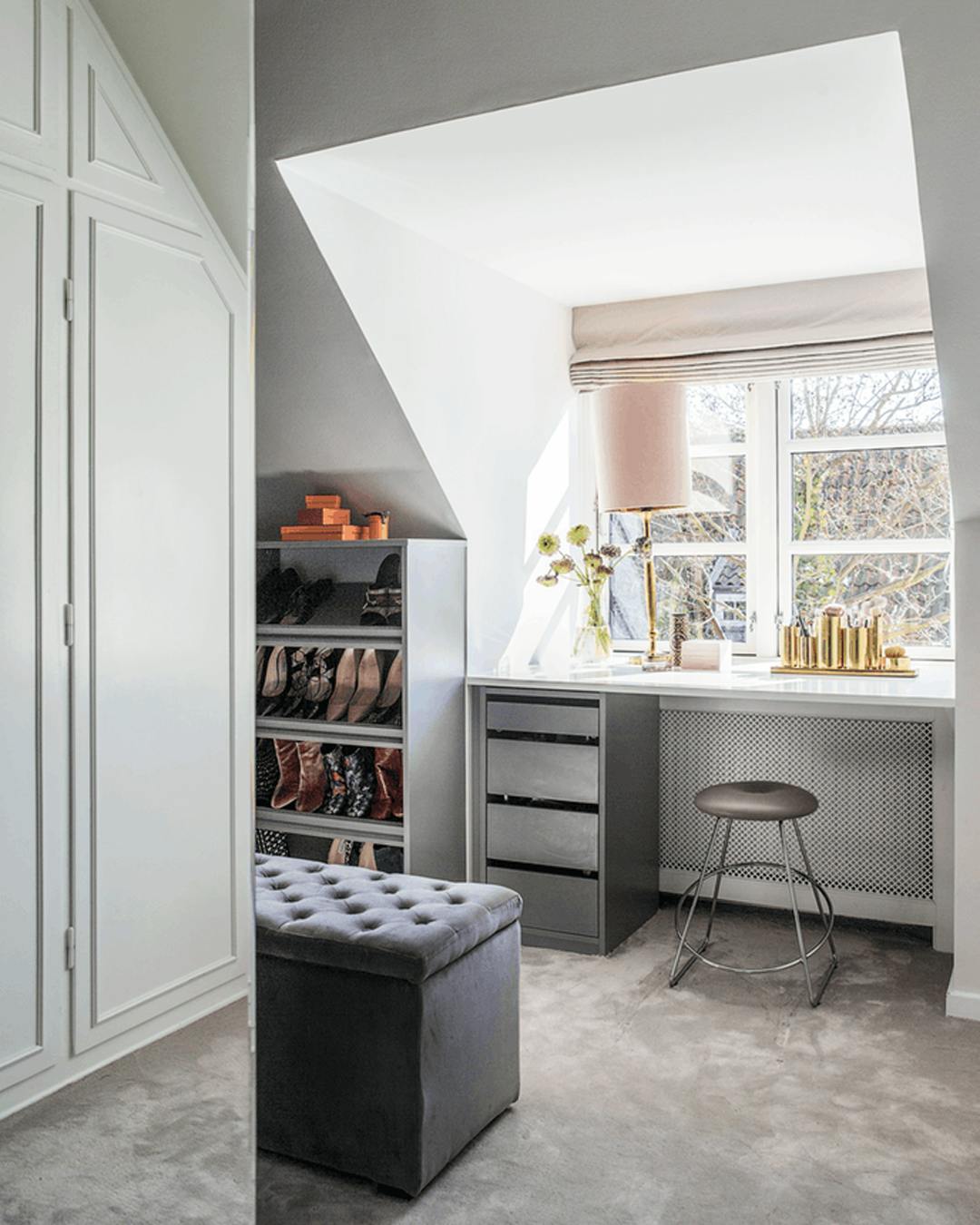 Har du en bred vindueskarm i soveværelset, kan du udnytte den til makeupbord. Stil en lille taburet under, som du let kan flytte rundt på. Taburetten er fra Design By Us. Skuffemodulet er specialbygget, og penneholderen er fra Casa Casino.